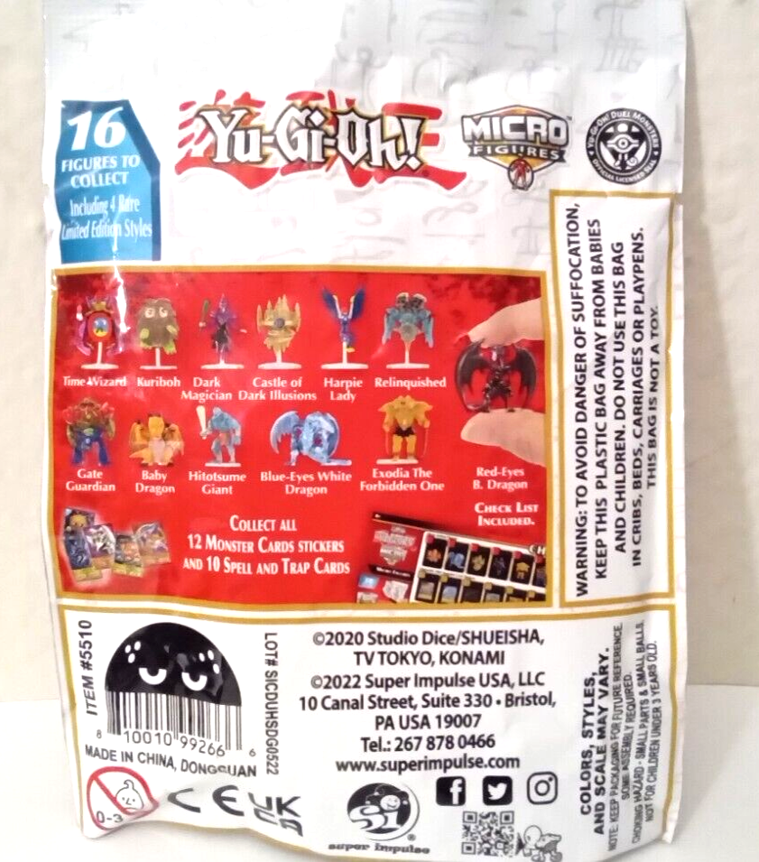 ** ** IF YOU DECIDE TO PURCHASE FROM US, ONCE YOU RECEIVE YOUR MERCHANDISE, PLEASE LEAVE POSITIVE FEEDBACK FOR US. WHEN WE GET YOUR FEEDBACK, WE WILL LEAVE POSITIVE FEEDBACK FOR YOU. **** LEAVING POSITIVE FEEDBACK IS A VERY IMPORTANT PART OF DOING SUCCESSFUL BUSINESS ON E-BAY. PLEASE REMEMBER TO LEAVE IT FOR US. P LEASE READ THE ENTIRE ITEM'S DESCRIPTION FOR SHIPPING OPTIONS AND RATES, AS WELL AS, PAYMENT AND FEEDBACK INSTRUCTIONS, BEFORE BIDDING !!!! This Auction is for 1 BRAND NEW CASTLIE OF DARK ILLUSIONS FIGURE COMES WITH STAND YuGiOh Mini Figure With Card was made by SUPER IMPULSE , CHINA in 2022 and is NO LONGER BE PRODUCED. **** T his is a BUY IT NOW AUCTION. If you want the merchandise, just use the "BUY IT NOW OPTION" RIGHT NOW and the item is yours. THERE IS NO WAITING FOR THE AUCTION TO END INVOLVED. The CASTLIE OF DARK ILLUSIONS Figure is GREAT for any YUGIHO & COMPANY FAN and makes the PERFECT COLLECTIBLE. The Figure is 1 inches Tall This Piece CAN NOT BE POSED COMES WITH 1 MICRO BABY DRAGON CARD & COMES WITH CHECK LIST & TOY BOOKLET. PACK WAS OPENED TO SEE WHAT FIGURE & CARD WAS INSIDE BUT REMENBER IT IS BRAND NEW. CHECK OUT MY OTHER YUGIHO MICRO FIGURES. and REMEMBER, THIS IS A BRAND NEW ITEM. We RECOMMEND this Item be used for DISPLAY PURPOSES ONLY and the SERIOUS COLLECTOR. NOTE NOT FOR CHILDEN UNDER 8. Anyone who is a YUGIHO & Company Fan will definitely want to own this Fantastic Item. It is a MUST HAVE piece for any YUGIHO Collector. Take a look at the other merchandise we have up for auction. If you are interested in purchasing more than 1 of our items, please do so and then WAIT FOR ME TO SEND YOUR INVOICE. This way you will MOST LIKELY RECEIVE A DISCOUNT ON SHIPPING and all items CAN USUALLY BE SHIPPED TOGETHER IN 1 BOX ( this really depends on the size and weight of the pieces being ordered.) **** IMPORTANT NOTE: IF YOU PAY FOR ITEMS INDIVIDUALLY, THEY MUST BE SHIPPED INDIVIDUALLY. If you have any questions, please feel free to contact us thru E-Bay. Shipping is via 1st Class Mail with a Delivery Confirmation TRACKING #. This service usually takes an average of 3 to 7 days after the item has been shipped, however, sometimes it can take longer. This method costs $6.50 for this individual auction and we will ship this piece SECURELY IN A STURDY BOX FOR SAFETY PURPOSES, NOT A BUBBLE ENVELOPE WITH JUST STAMPS ON IT AND NO TRACKING INFORMATION. Priority Mail Shipping with Automatic Insurance covering the item Purchase Price and a Delivery Confirmation TRACKING # (this service usually takes 2 to 5 days after the item has been sent) is also available and costs $14.00 for this individual auction. **** AND AGAIN, IF YOU DECIDE TO PURCHASE FROM US, ONCE YOU RECEIVE YOUR MERCHANDISE, PLEASE LEAVE POSITIVE FEEDBACK FOR US. WHEN WE GET YOUR FEEDBACK, WE WILL LEAVE POSITIVE FEEDBACK FOR YOU. LEAVE POSITIVE FEEDBACK FOR YOU. **** LEAVING POSITIVE FEEDBACK IS A VERY IMPORTANT PART OF DOING SUCCESSFUL BUSINESS ON E-BAY. PLEASE REMEMBER TO LEAVE IT FOR US.