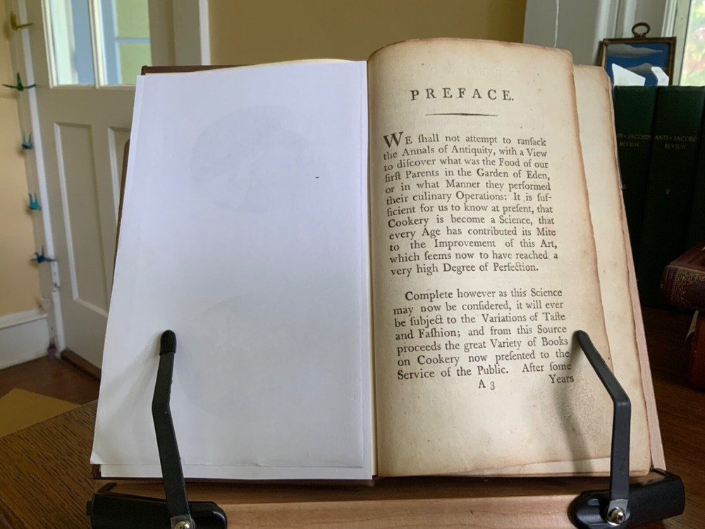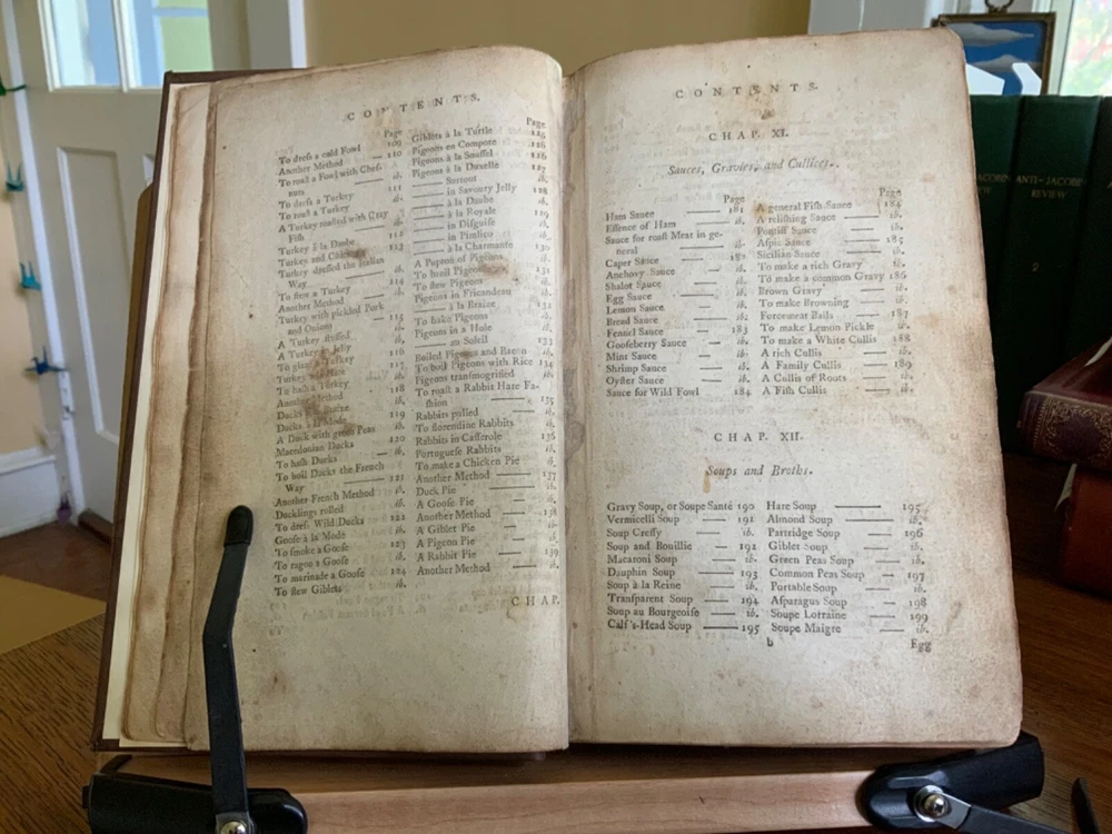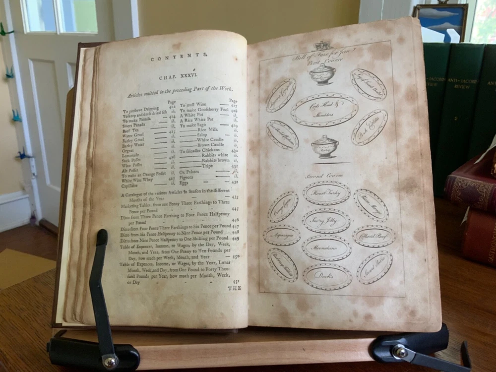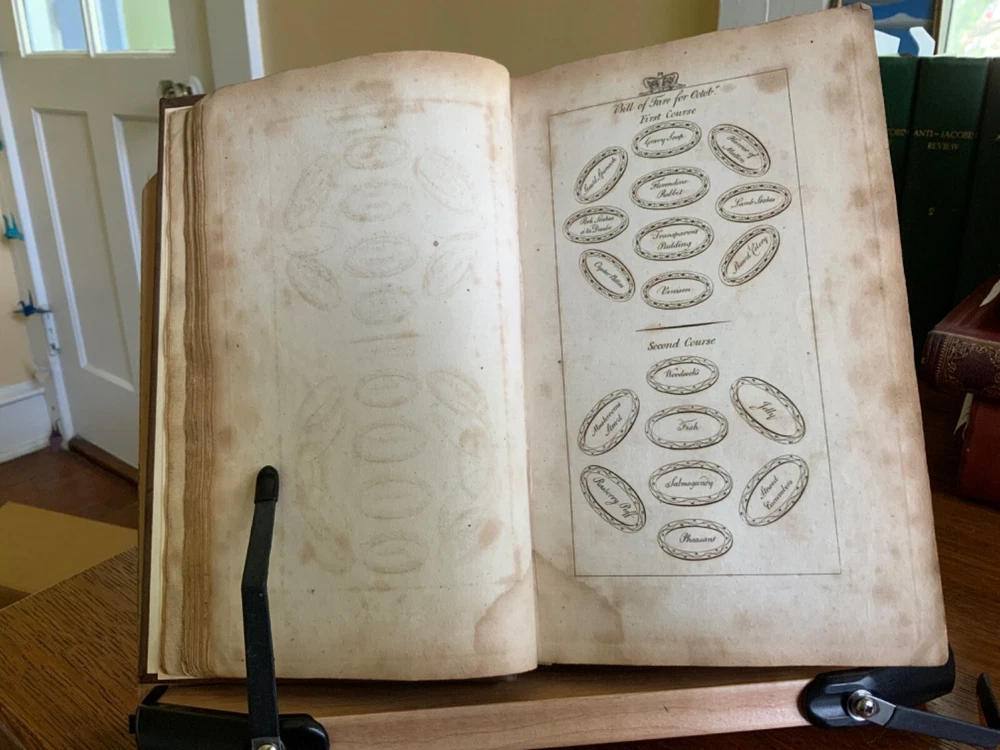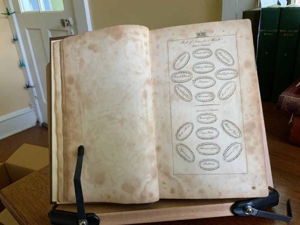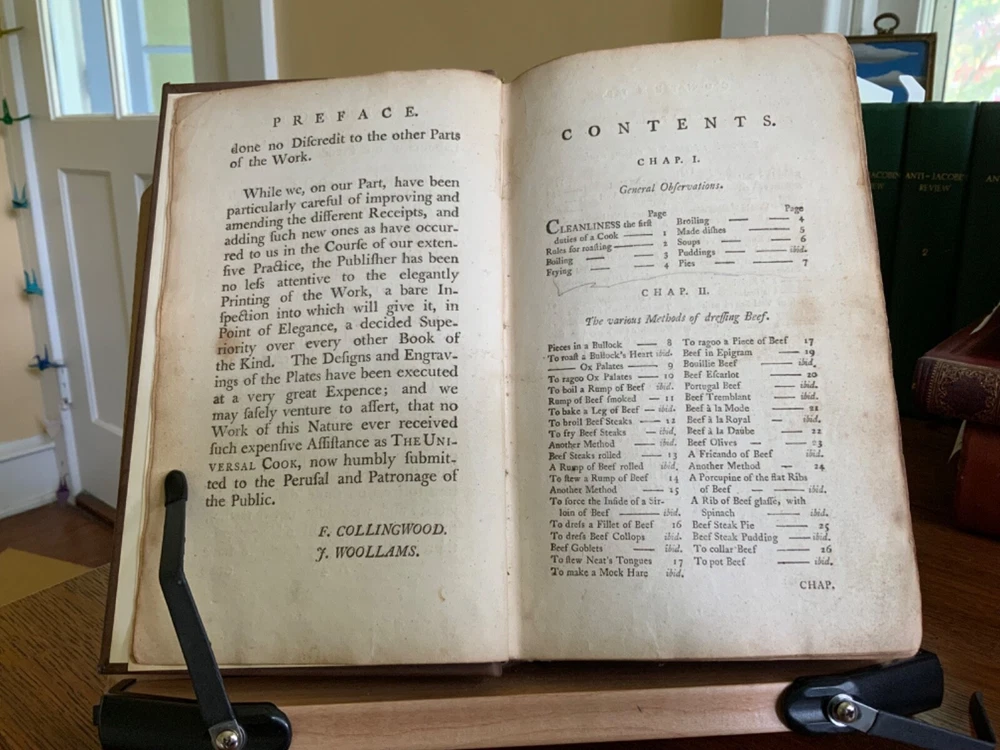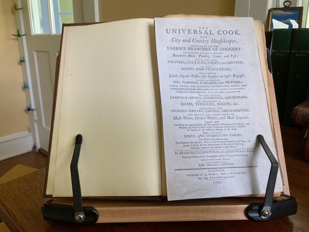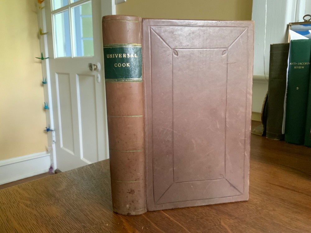 The universal cook, and city and country housekeeper : containing all the various branches of cookery ... Together with directions for baking bread, the management of poultry and the dairy, and the kitchen and fruit garden; with a catalogue of the various articles in season in the different months of the year. Besides a variety of useful and interesting tables. By Francis Collingwood, and John Woollams, The Second Edition. Printed by R. Noble, for J. Scatcherd, London, 1797, 451 pp plus publisher’s list, thirteen engraved plates, modern leather, 9 x 5.5”, 8vo. In fair condition. Later binding accomplished in the 1990’s. Light wear to extremities with minor scuffing to surface of leather. Handsomely bound. End papers fresh and clean. Gift inscription on pastedown dated 1996. Lacking title and frontis portrait. Facsimiles have been placed in the front gutter for reference. Light toning throughout with scattered, moderate foxing. Light offsetting from plates. Free of known marginalia. Collated and complete without title and frontis. Binding intact. Rear fly has old hand notations. Please see photos. Scarce cookery. The authors were described as the principal cooks at the Crown and Anchor Tavern. An early English cook book by “restaurant chefs” rather than by a housewife or cook working in a noble household. This work received the accolade of being translated into French in 1810. Gives a month-to-month calendar of appropriate cuisine for the seasons. COLM1797FMNX-823