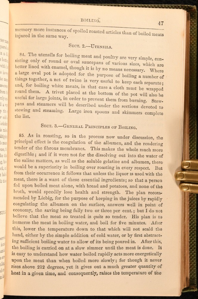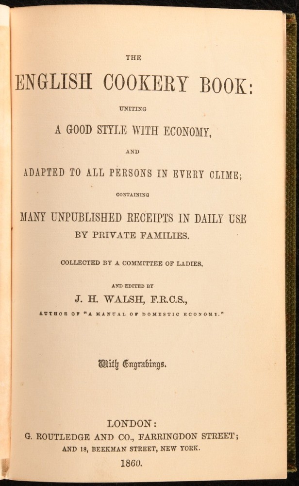 Click here to see our other books! The English Cookery Book Uniting a Good Style with Economy, and Adapted to All Persons in Every Clime; Containing Many Unpublished Receipts in Daily Use by Private Families. Collected by a Committee of Ladies J. H. Walsh 1860 G. Routledge and Co. : London 6.5" by 4" viii, 375pp SUMMARY An uncommon guide to English food and cookery for daily and economical use, illustrated with engraved plates. Illustrated,Leather Binding,Publishers' Original Binding,Uncommon Overall Condition: Good Only This book weighs 0.5 KG when packed UK Postage: £ 3.99 US Postage: £ 15.99 EU Postage : £ 13.99 European Postage: £ 14.99 Asia Postage: £ 18.99 Worldwide Postage: £ 19.99 DESCRIPTION Collected by a committee of ladies and edited by J. H. Walsh, a foremost English sports writer who often wrote under the pseudonym "Stonehenge". In the publisher's quarter crushed morocco. Leather backstrip is detached but is present and tipped in to the book. A concise guide to English cookery, with advice on the general preparation and keeping of food, as well as techniques of boiling, stewing, soup-making, puddings and principles of carving. Illustrated with engravings, including a frontispiece and six plates. Collated and complete against two identical copies. With the bookplate belonging to a member of the Vernon family, with the initials VW and the family's motto 'Vernon Semper Viret'. CONDITION In the original quarter crushed morocco binding, with cloth boards. Externally, backstrip is detached but has been tipped in separately to the book, with instances of fading and chips to the head and tail. With minor bumping to the corners and marks to the boards. Bookplate to the front pastedown belonging to a member of the Vernon family, with the initials VW and the family's motto 'Vernon Semper Viret'. Internally, firmly bound with bright and clean pages. Overall Condition: Good Only GLOSSARY OF TERMS Overall Condition (Dustwrapper condition rating is shown after that for the book itself, where a dustwrapper is present) Fine - Very well preserved copy showing very little wear Very Good Indeed - Only one or two minor faults, really a very attractive copy Very Good - Quite a wide term meaning no major faults but probably several smaller ones often expected given the age of the book, but still a respectable copy Good - Meaning not very good. Some more serious faults as will be described in the condition report under 'condition' Good Only - Meaning one or more faults that could really do with repair Fair - As with good only above but with other faults leaving a compromised copy even after repair Poor - Really bad and possibly seriously incomplete. We only sell books in this condition where their rarity or value makes them attractive none the less. Major defects will be described. GUARANTEE We offer a full money back guarantee on our descriptions. Please ask for details and conditions. We prefer PAYPAL. If you pay via PAYPAL we will post the item off the same or the next working day with the postage you have selected. Please note we cannot accept USD cheques