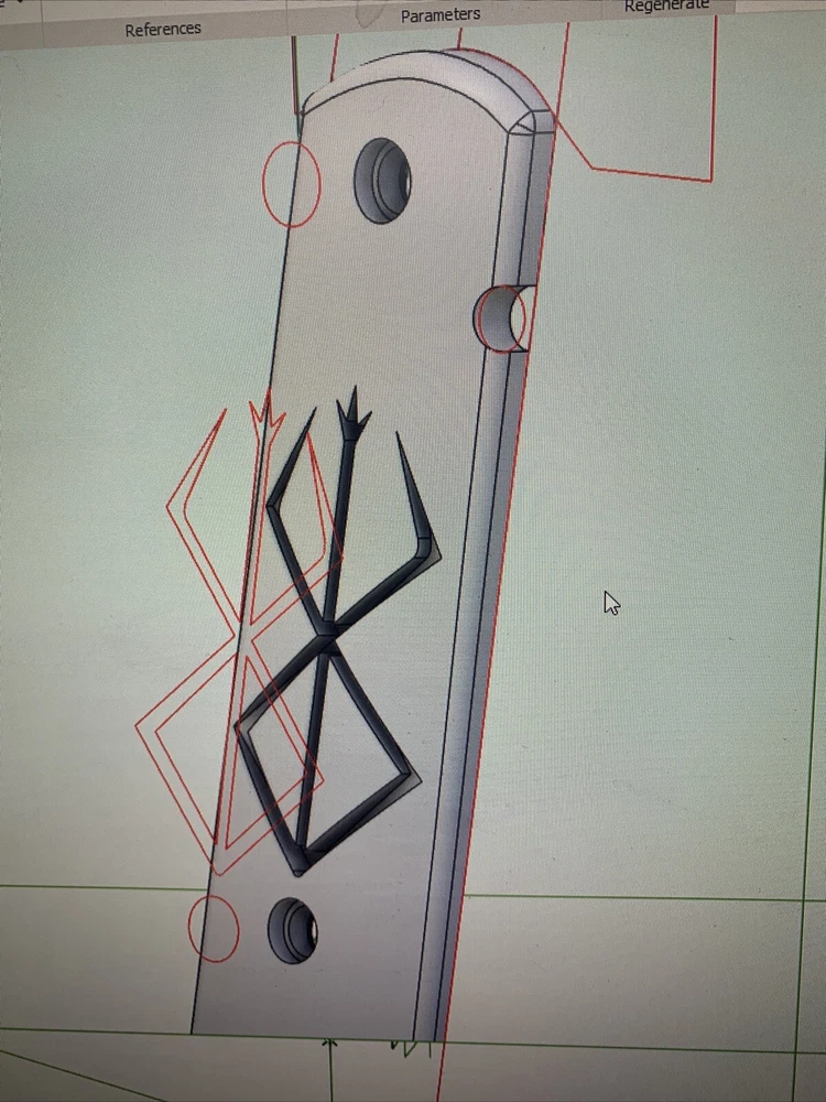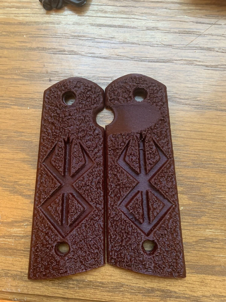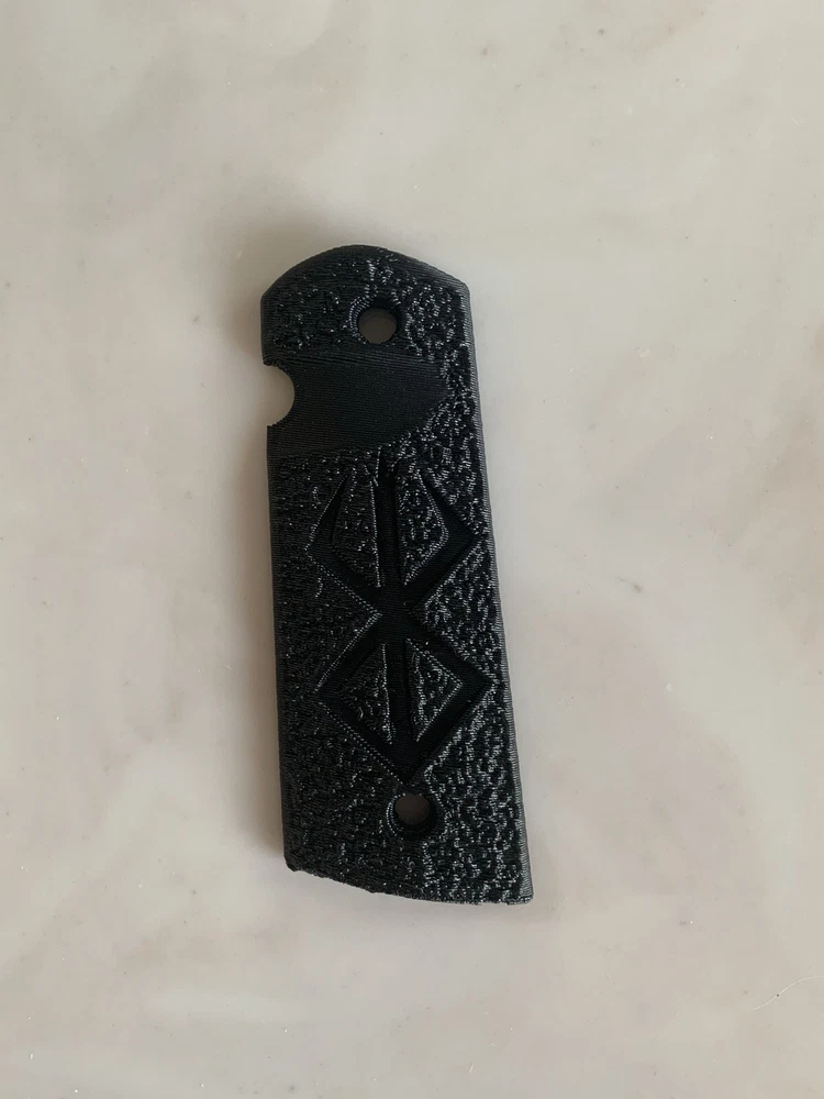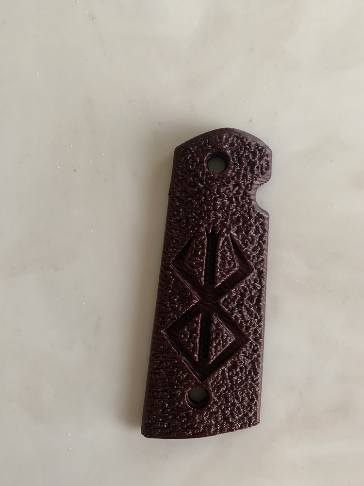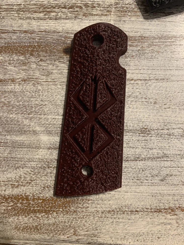 1911 full size magwell grips - Custom Made Rune only. The grips are custom made by me using completely USA sourced materials, the grips are a carbon fiber composite polymer. They are designed to fit standard grip screw bushings on all full grip 1911 models, government or commander. The safety clearance is mirrored but designed around a single sided safety, most ambi safety’s would work but I cannot confirm all models. The grips are medium aggressive in texture but can be specially made in a mild texture of the same design. The grips sell as the two panels without mounting hardware. The inlay design is my own. Options available as special requests coordinated ahead of time and not available with discounts: The listing is for a red grip but contact me if you would like black or blue or dark grey, these are shown in the picture without an inlay. There is a secondary grip profile for larger hands that extends the size ~ 3/16” from roughly 1.5” at the bottom this option cost $5 more per set as the material costs increase. The panels essentially take up the entire flat area from mainspring to front strap with this option.
