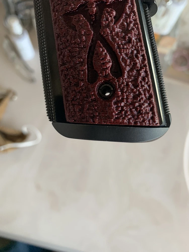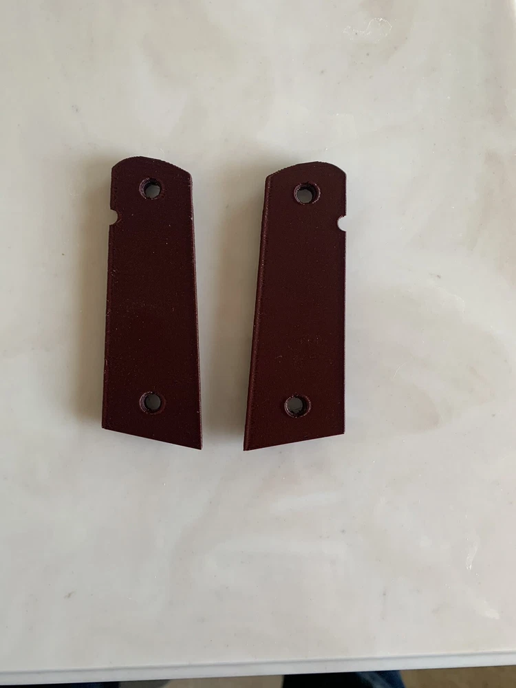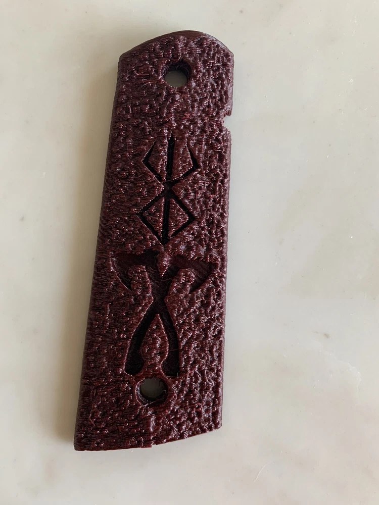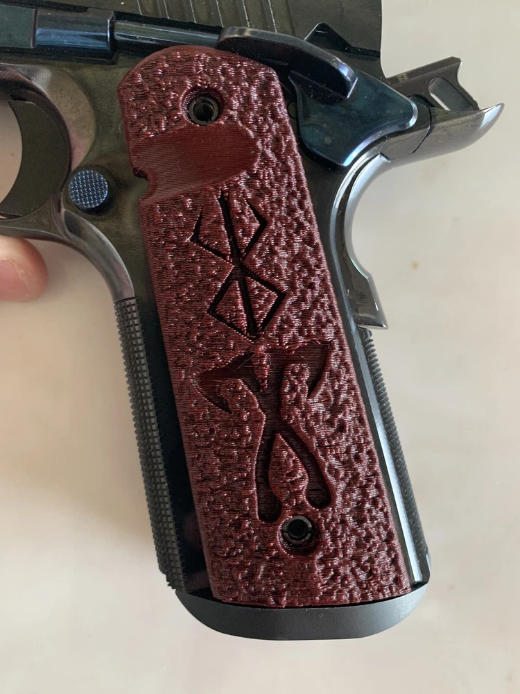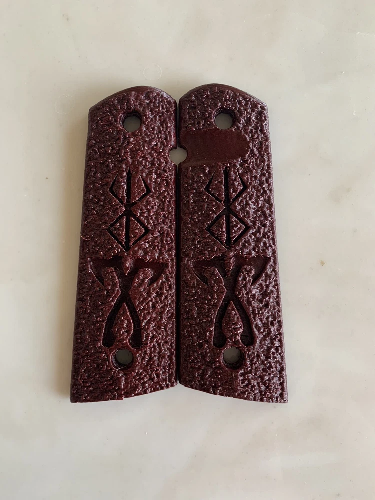 1911 full size magwell grips - red viking axe inlay Custom Made. The grips are custom made by me using completely USA sourced materials, the grips are a carbon fiber composite polymer. They are designed to fit standard grip screw bushings on all full grip 1911 models, government or commander. The safety clearance is mirrored but designed around a single sided safety, most ambi safety’s would work but I cannot confirm all models. The grips are medium aggressive in texture but can be specially made in a mild texture of the same design. The grips sell as the two panels without mounting hardware. The inlay design is my own. Options available as special requests coordinated ahead of time and not available with discounts: The listing is for a red grip but contact me if you would like black or blue or dark grey, these are shown in the picture without an inlay. There is a secondary grip profile for larger hands that extends the size ~ 3/16” from roughly 1.5” at the bottom this option cost $5 more per set as the material costs increase. The panels essentially take up the entire flat area from mainspring to front strap with this option.