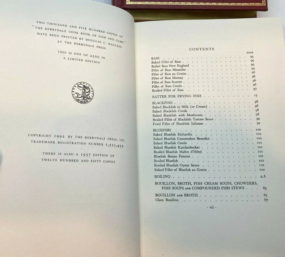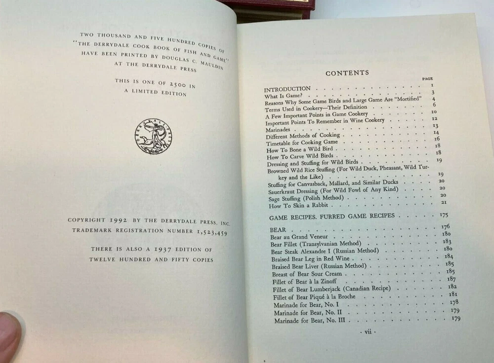 Up for sale is a 1992 Limited Edition of "THE DERRYDALE COOK BOOK OF FISH AND GAME" by L. P. De Gouy. This edition is limited to just 2500 copies. Like other hunting and fishing classics Derrydale published in the 1930s, this cookbook has only become better with time. This is a no-nonsense, practical guide to cooking virtually every kind of wild game with everything from simple recipes to gourmet level preparation. It was the first complete game cookbook published in North America and it remains one of the best. The book is in very good condition. Light rubbing/shelf wear to the boards along the edges, corners, and top/bottom of the spine panel. Light rubbing/shelf wear to the front/rear boards as well as along the spine panel. The spine and pages are very tight. Some shelf wear to the gilded page ends. The spine and pages are very tight with strong hinges. There are no other marks, tears, book plates or writing in this book. Please review all photos for your best idea of the condition. Shipping on this item will be $7.99. Thank You and Good Luck!!