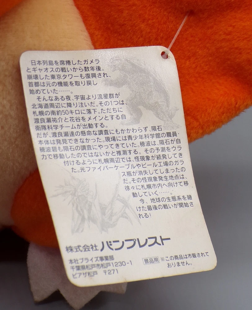 Vintage 1996 Banpresto Gyaos 7" tall plush toy with original tag! Massively adorable SD style plush of one of Gamera's greatest kaiju enemies! This plush shows some wear, with some spots of discoloration on the fur, as well as on the eyes. The tag displays well, and features some awesome art from the Gamera Movie! A Great addition to any plush collection! See photos for details. All items are sold as-is and we do not accept returns, so please ask any questions you may have before bidding. ZERO FEEDBACK or other questionable bidders, please email to obtain permission to participate in our auctions BEFORE bidding. Please feel free to stop by our RETAIL LOCATION to view items in person.