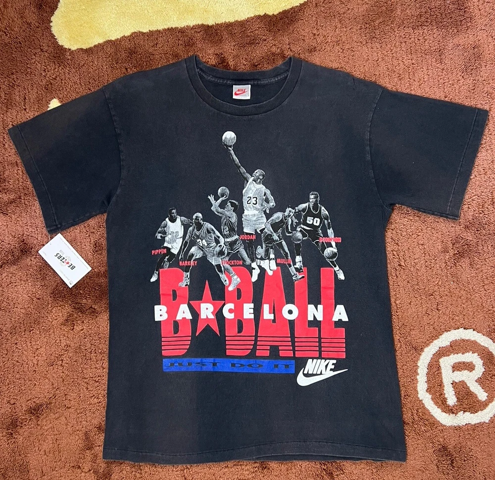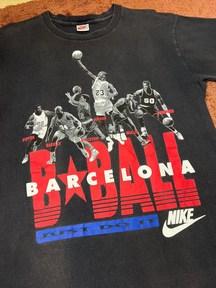 This vintage Nike Barcelona Dream Team Olympics T-shirt is a must-have for any basketball fan. Featuring icons like Jordan, Barkley, Pippen, Mullins,Robinson, and Stockton! This shirt is a great addition to any collection. The shirt is perfect for any casual occasion and is sure to turn heads with its unique design. The black vintage faded color makes it easy to pair with any outfit, and the comfortable fabric ensures that you'll love wearing it all day. Up For Sale is 100% Authentic Pre-Owned 1996 Nike Barcelona Dream Team Olympics “Just Do It” Black T *Rare* In Excellent Vintage Condition(Faded and worn to perfection) Size L Pit to Pit-20’ Length-27.5’ Our Store Provides a Variety of things like hard to find Vtg Bape products(90’s-00’s Nigo Era), Other Street wear, vintage t shirts, toys, etc. Don’t miss out on grabbing these rare product for a great price. Don’t Hesitate!! Feel free to shoot offers and check out our other items. Check Out Beaters.Club💫