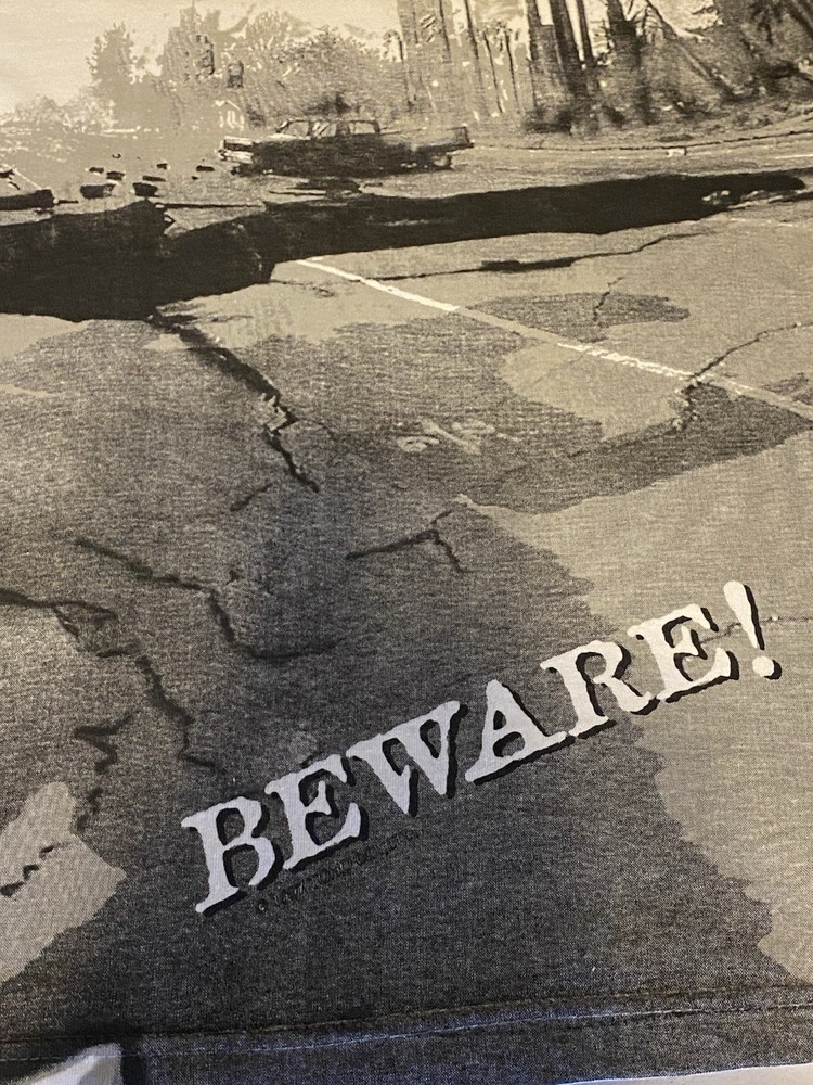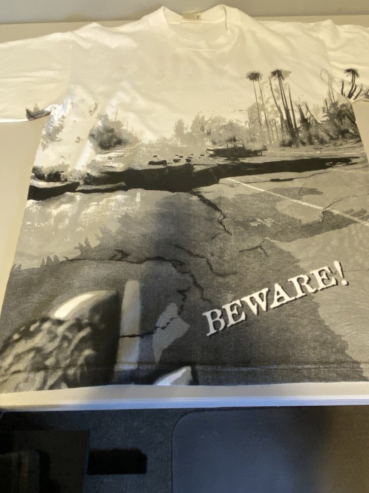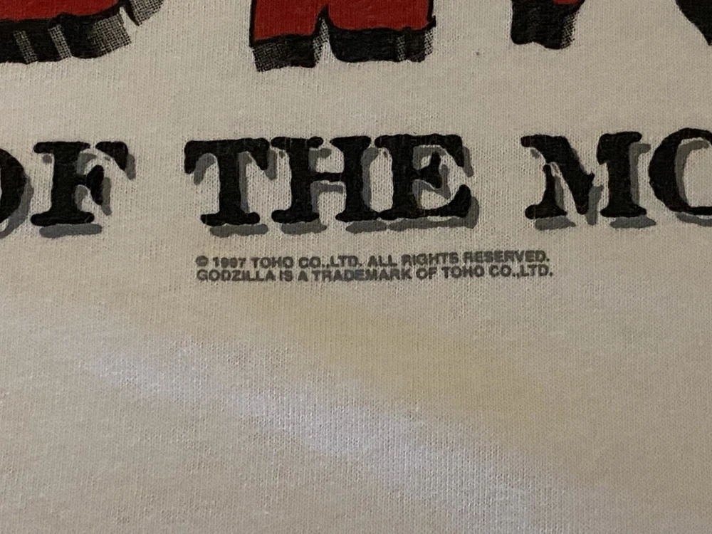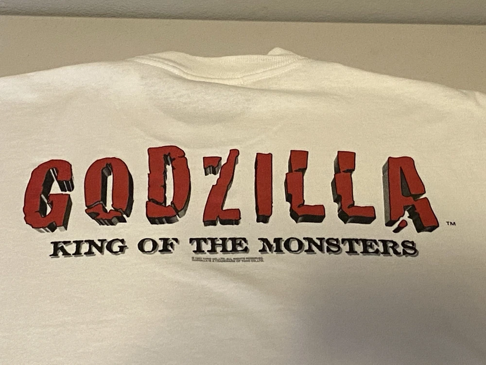 1997 Licensed GODZILLA Promo King of the Monsters T-Shirt Art Print on the front - NOTE Godzilla shadow on the road in the print Script on the back Size L "International buyers – please note: Import duties, taxes, and charges aren't included in the item price or postage cost. These charges are the buyer's responsibility. Please check with your country's customs office to determine these additional costs before bidding or buying."