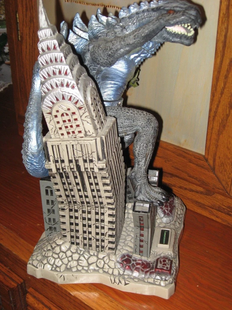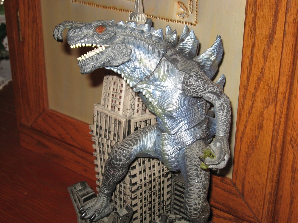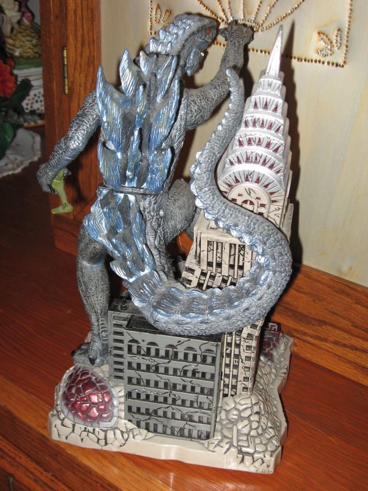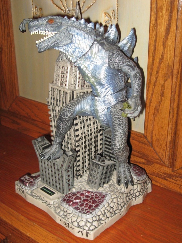 1998 TRENDMASTERS AND TOHO BY CHINA GODZILLA ON THE EMPIRE STATE BUILDING ANIMATED TOY FIGURE COIN BANK AND MEN LARGE GODZILLA T-SHIRT 2006 NEW WITHOUT TAGS THE PRINT IS FRONT THE ORIGINAL POSTER WAY BACK WHEN IT CAME OUT 1st TIME IN 1956 MOVIE. THE T-SHIRT WAS 2006 PRODUCTION T-SHIRT WHEN THE OTHER GODZILLA MOVIE CAME OUT COIN BANK STANDS 12" TALL PUT A COIN IN AND HE ROARS,LIGHTS UP AND MOVES AROUND EXCELLENT CONDITION , EXCEPT MISSING BATTERY PACK DOOR,FELL OFF AND LOST IT SOMEWHERE OVER THE YEARS. ADULT OWNED AND STORE IN GLASS SHOWCASE.