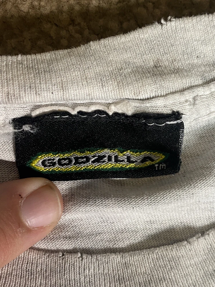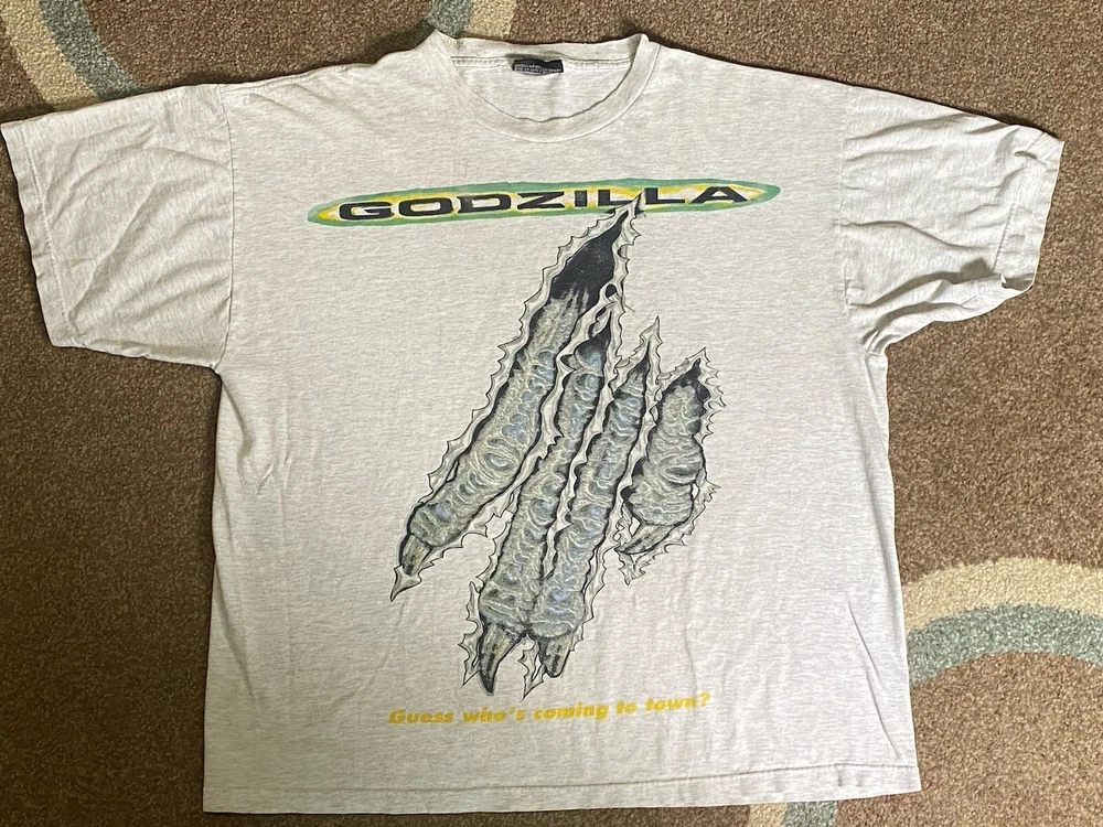 Channel your inner sci-fi lover with this amazing 1998 Godzilla Movie Promo T-Shirt. The relaxed fit and regular size type make it the perfect addition to any men's wardrobe. This gray t-shirt features a round neckline and short sleeves, making it perfect for casual outings or movie nights with friends. The iconic Godzilla character is prominently displayed on the shirt, making it a must-have for any fan of the monster movies. The shirt is of Japanese brand and has a claw theme, adding a unique touch to its design. Make a statement with this Godzilla T-Shirt and show off your love for the classic movie monster.