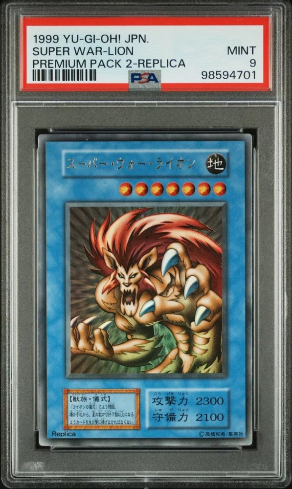 This is a 1999 Yu-Gi-Oh! Japanese Premium Pack 2 replica card of "Super War-Lion" from the GX series. The card is Ultra Rare and features premium quality. It is a Fusion card of the character "Super War Lion" and is not autographed. The manufacturer is Konami. The card is from the "- Yugi -" set and is a highly sought-after collectible in the Yu-Gi-Oh! Trading Card Game.