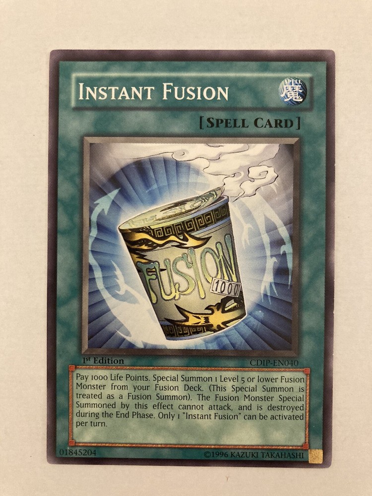 | Card Text | Pay 1000 Life Points. Special Summon 1 Level 5 or lower Fusion Monster from your Fusion Deck. (This Special Summon is treated as a Fusion Summon). The Fusion Monster Special Summoned by this effect cannot attack, and is destroyed during the End Phase. Only 1 Instant Fusion can be activated per turn. |