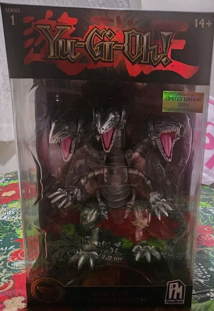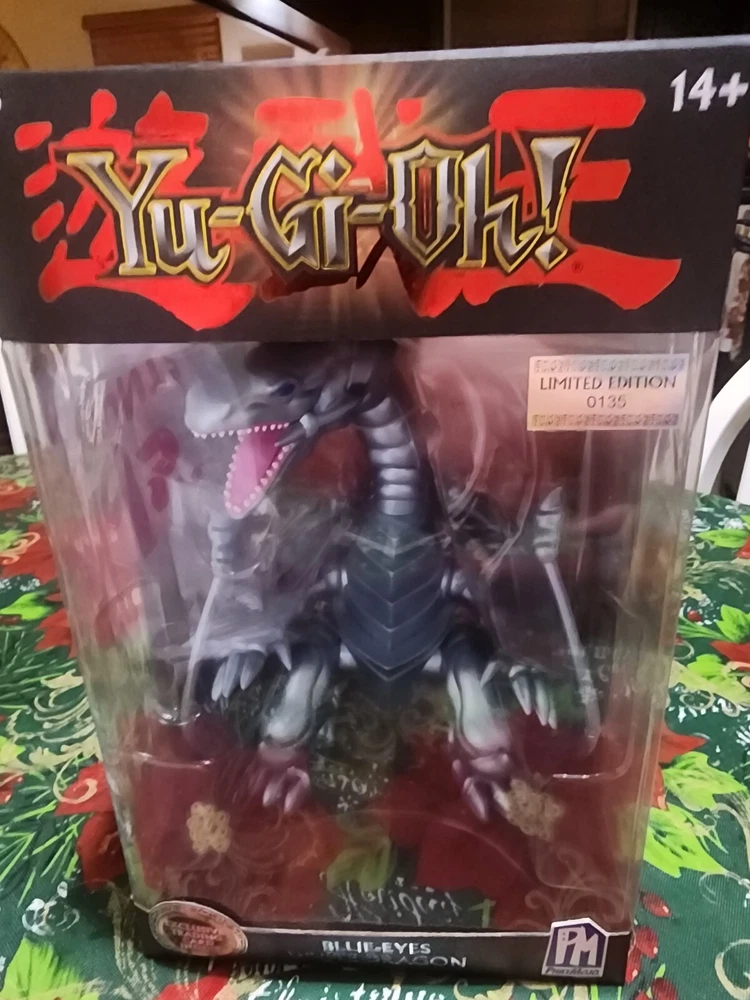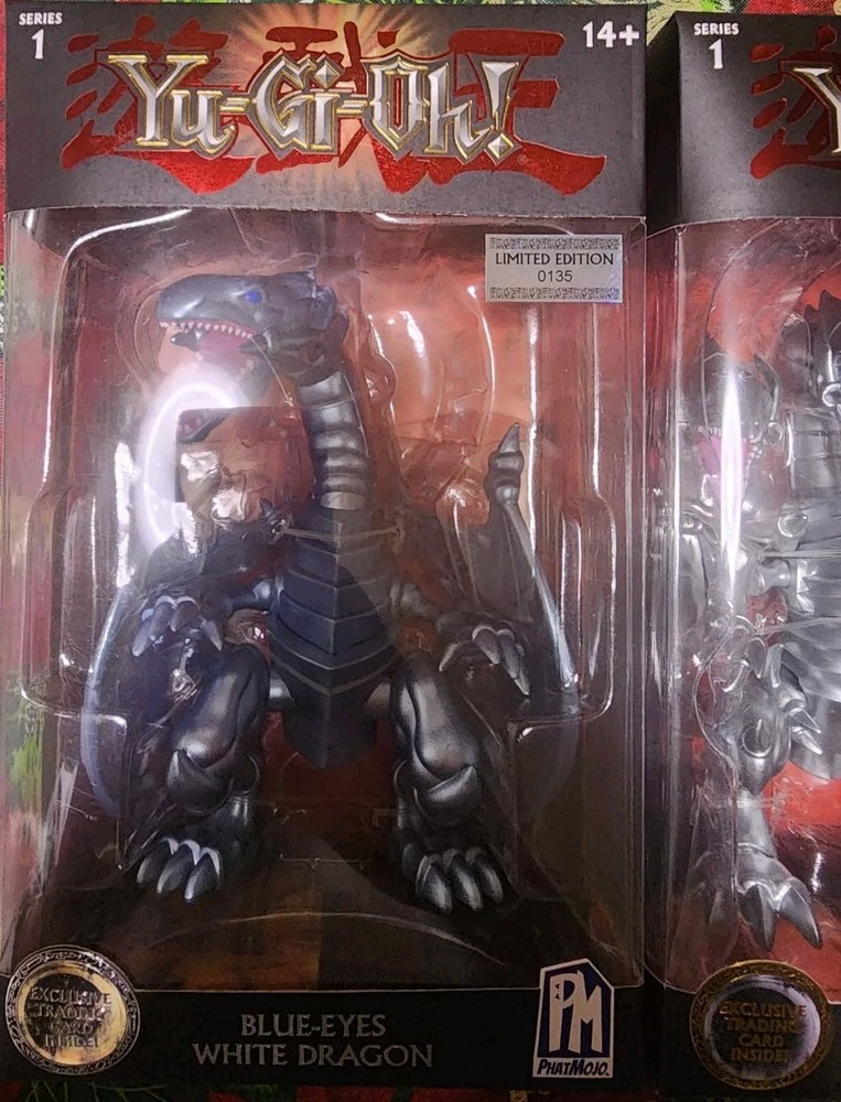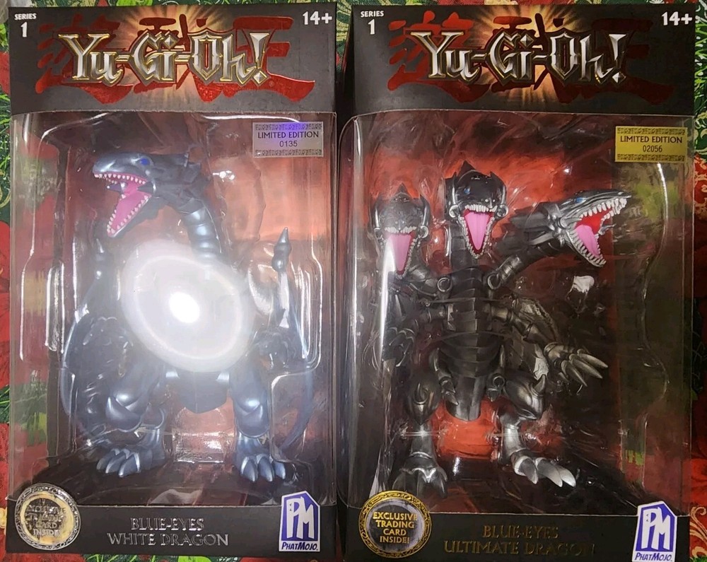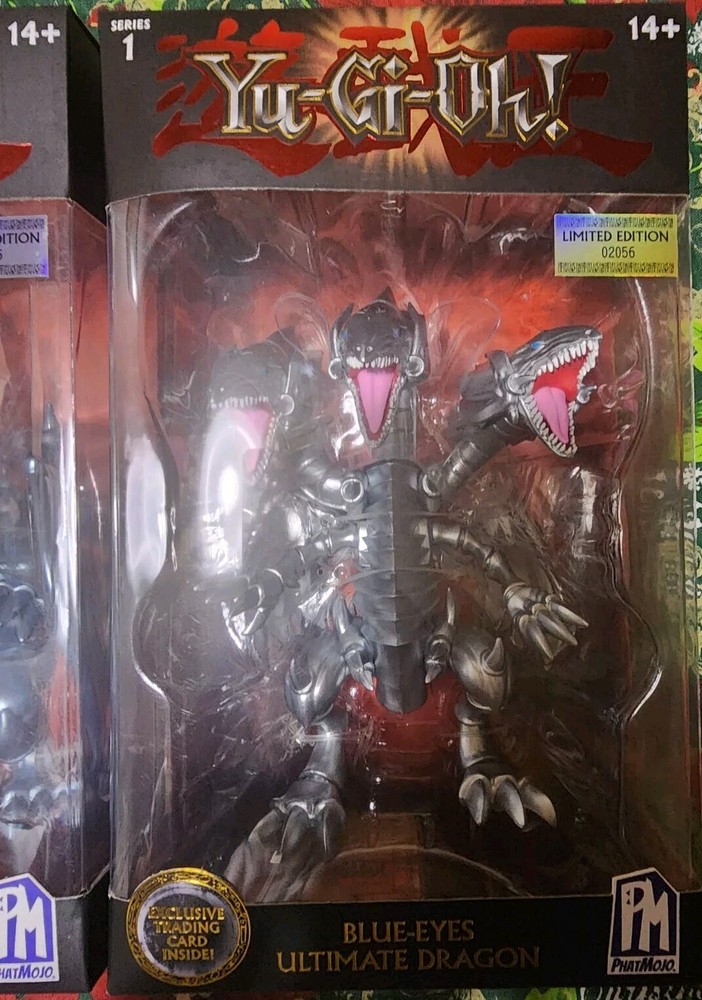 The product is a limited edition Blue Eyes Ultimate Dragon action figure from the Yu-Gi-Oh! franchise, produced by PhatMojo. It also includes an exclusive card featuring Dragon. The figure is made of plastic and is part of the Yu-Gi-Oh! theme, with a model number DF5704. This collectible item was manufactured in the current time period. You will receive both figures shown with rare limited cards inside.