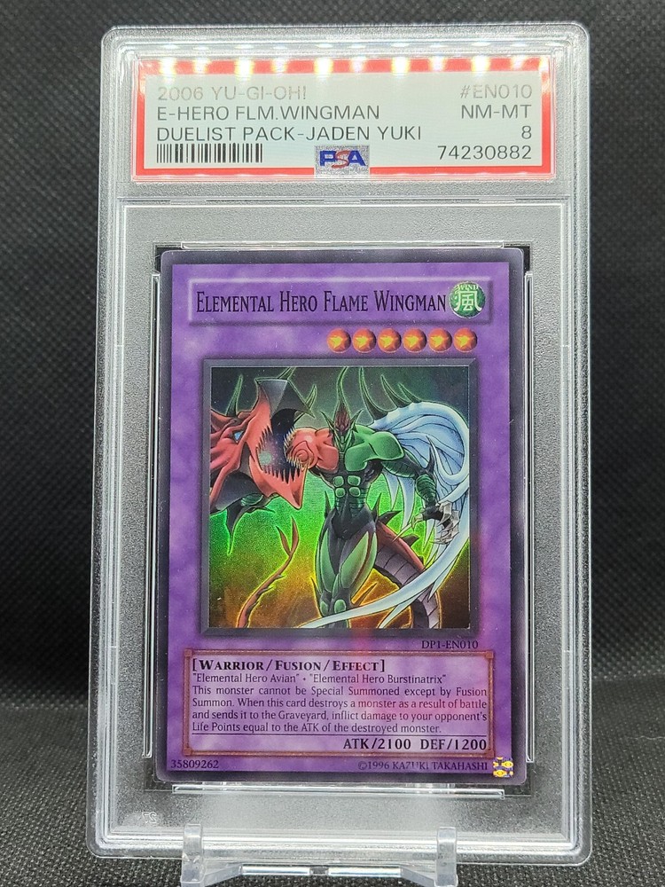 2006 YU-GI-OH! GX Duelist Pack 1: Jaden Yuki Elemental Hero Flame Wingman DP1-EN010 Super Rare PSA 8 NM-MT All cards ship with tracking and a packing slip! All raw cards listed at $20 and under are shipped with eBay Standard Envelope for Trading Cards up to $20. They will ship in a PWE (Plain White Envelope) with penny sleeve and top loader. All raw cards listed above $20 are shipped USPS Ground Advantage. They will ship in a bubble mailer with penny sleeve and top loader. All autographed raw cards are shipped USPS Ground Advantage and will have a fixed shipping price of 4.99. They will ship in a bubble mailer with penny sleeve and top loader. All graded cards are shipped USPS Ground Advantage and will have a fixed shipping price of 4.99. They will ship in a bubble mailer with sleeve and bubble wrap. The card pictured is what you will receive. However, if I have more than 1 copy you will receive the card described in the title, but it may not be the copy of the card that is pictured. Please feel free to message me with any questions or concerns. Leaving feedback is also greatly appreciated. I appreciate your business and enjoy your card(s)!