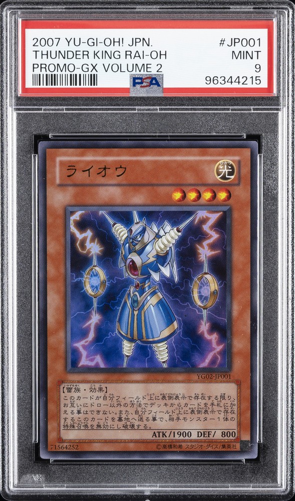 2007 YU-GI-OH! JAPANESE PROMO GX VOLUME 2 #JP001 THUNDER KING RAI-OH PSA 9 2007 YU-GI-OH! JAPANESE PROMO GX VOLUME 2 #JP001 THUNDER KING RAI-OH PSA 9 Purchase Info Thank you for your interest in this item consigned with PSA! By purchasing or making an offer on this item, you acknowledge and agree to the following terms: All sales are final. Returns not accepted. Payment must be made upon purchase of the item. All items are sold "as is" and without warranty of Collectors Universe, Inc. (d/b/a PSA), and ANY AND ALL IMPLIED WARRANTIES ARE DISCLAIMED AND EXCLUDED. Sales tax may apply depending on shipping address. PSA does not guarantee that another third-party grading company's authentication or certification of an item as genuine is correct or accurate. Neither a difference of opinion between third-party grading companies about authenticity, nor a company's subsequent reversal of its earlier authentication or certification of an item, will be a basis for rescinding a sale. Any dispute with another third-party grading company relating to the authenticity of an item must be resolved directly with that other company. Collectors' maximum liability in the event of loss or damage to an item during shipping will be the lesser of (a) the price paid for the item and (b) the change in fair market value of the item. You release Collectors from all other liability including for any claims of punitive damages, emotional distress, consequential damages, lost profits, or lost interest, except as prohibited by law. Shipping Purchased Items will be shipped directly from PSA Vault. You stay hands-free. PSA Vault When you purchase this item, you can save on sales tax and selling fees by keeping it in the PSA Vault, official Vault of eBay. Items already in PSA Vault and will be sent to PSA Vault will have no shipping charge Storage of any items with the PSA Vault will be subject to the PSA Vault Terms of Service. Consignment PSA has competitive rates on the world's largest collectibles marketplace with the option to list from the PSA Vault or immediately after PSA authentication and grading. Sale Price Under $100 $100 - $499 $500 - $999 $1,000 - $2,499 $2,500 - $4,999 $5,000+ Seller Fee 16% 14% 13% 10% 9% 7% Sellers pay a single fee as reflected above; no additional eBay fees are incurred. There is a $5 minimum fee on sold items.