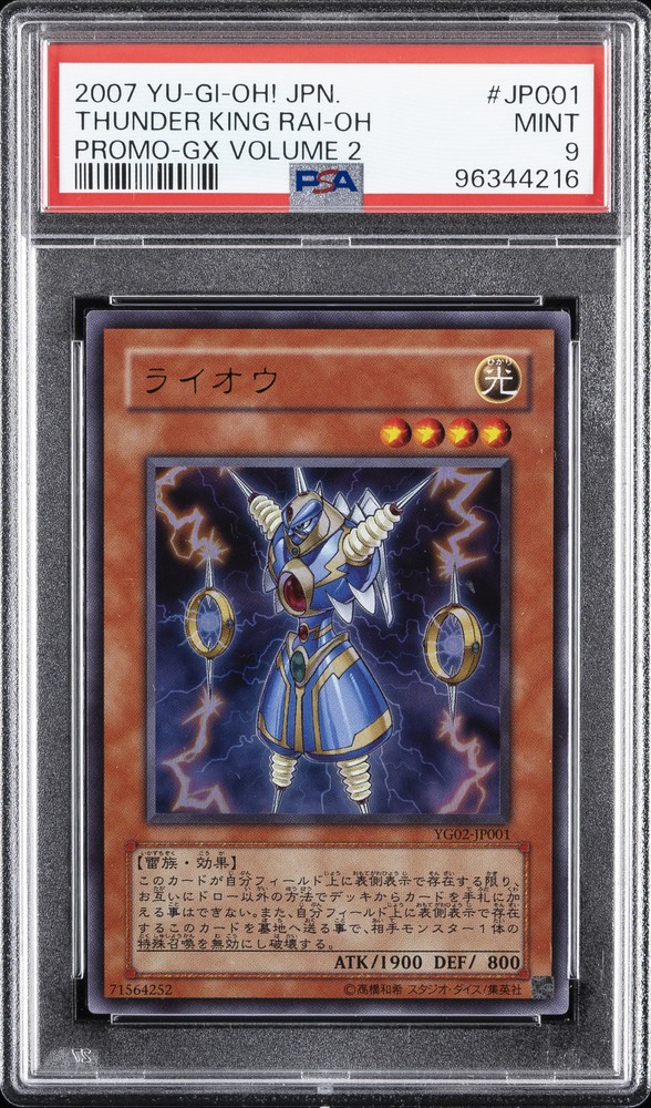 2007 YU-GI-OH! JAPANESE PROMO GX VOLUME 2 #JP001 THUNDER KING RAI-OH PSA 9 2007 YU-GI-OH! JAPANESE PROMO GX VOLUME 2 #JP001 THUNDER KING RAI-OH PSA 9 Purchase Info Thank you for your interest in this item consigned with PSA! By purchasing or making an offer on this item, you acknowledge and agree to the following terms: All sales are final. Returns not accepted. Payment must be made upon purchase of the item. All items are sold "as is" and without warranty of Collectors Universe, Inc. (d/b/a PSA), and ANY AND ALL IMPLIED WARRANTIES ARE DISCLAIMED AND EXCLUDED. Sales tax may apply depending on shipping address. PSA does not guarantee that another third-party grading company's authentication or certification of an item as genuine is correct or accurate. Neither a difference of opinion between third-party grading companies about authenticity, nor a company's subsequent reversal of its earlier authentication or certification of an item, will be a basis for rescinding a sale. Any dispute with another third-party grading company relating to the authenticity of an item must be resolved directly with that other company. Collectors' maximum liability in the event of loss or damage to an item during shipping will be the lesser of (a) the price paid for the item and (b) the change in fair market value of the item. You release Collectors from all other liability including for any claims of punitive damages, emotional distress, consequential damages, lost profits, or lost interest, except as prohibited by law. Shipping Purchased Items will be shipped directly from PSA Vault. You stay hands-free. PSA Vault When you purchase this item, you can save on sales tax and selling fees by keeping it in the PSA Vault, official Vault of eBay. Items already in PSA Vault and will be sent to PSA Vault will have no shipping charge Storage of any items with the PSA Vault will be subject to the PSA Vault Terms of Service. Consignment PSA has competitive rates on the world's largest collectibles marketplace with the option to list from the PSA Vault or immediately after PSA authentication and grading. Sale Price Under $100 $100 - $499 $500 - $999 $1,000 - $2,499 $2,500 - $4,999 $5,000+ Seller Fee 16% 14% 13% 10% 9% 7% Sellers pay a single fee as reflected above; no additional eBay fees are incurred. There is a $5 minimum fee on sold items.