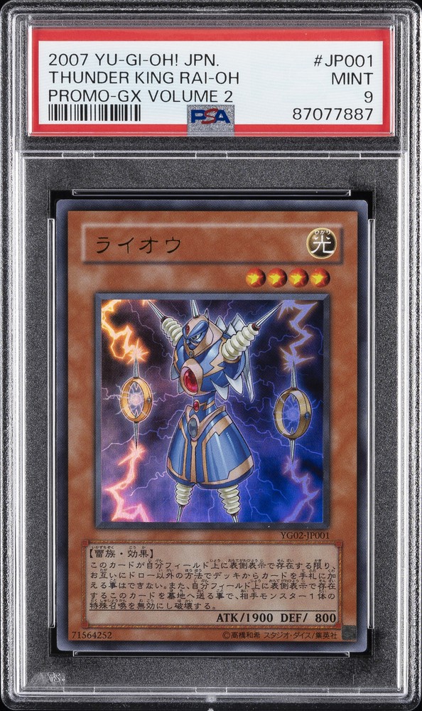 2007 YU-GI-OH! JAPANESE PROMO GX VOLUME 2 #JP001 THUNDER KING RAI-OH PSA 9 2007 YU-GI-OH! JAPANESE PROMO GX VOLUME 2 #JP001 THUNDER KING RAI-OH PSA 9 Purchase Info Thank you for your interest in this item consigned with PSA! By purchasing or making an offer on this item, you acknowledge and agree to the following terms: All sales are final. Returns not accepted. Payment must be made upon purchase of the item. All items are sold "as is" and without warranty of Collectors Universe, Inc. (d/b/a PSA), and ANY AND ALL IMPLIED WARRANTIES ARE DISCLAIMED AND EXCLUDED. Sales tax may apply depending on shipping address. PSA does not guarantee that another third-party grading company's authentication or certification of an item as genuine is correct or accurate. Neither a difference of opinion between third-party grading companies about authenticity, nor a company's subsequent reversal of its earlier authentication or certification of an item, will be a basis for rescinding a sale. Any dispute with another third-party grading company relating to the authenticity of an item must be resolved directly with that other company. Collectors' maximum liability in the event of loss or damage to an item during shipping will be the lesser of (a) the price paid for the item and (b) the change in fair market value of the item. You release Collectors from all other liability including for any claims of punitive damages, emotional distress, consequential damages, lost profits, or lost interest, except as prohibited by law. Shipping Purchased Items will be shipped directly from PSA Vault. You stay hands-free. PSA Vault When you purchase this item, you can save on sales tax and selling fees by keeping it in the PSA Vault, official Vault of eBay. Items already in PSA Vault and will be sent to PSA Vault will have no shipping charge Storage of any items with the PSA Vault will be subject to the PSA Vault Terms of Service. Consignment PSA has competitive rates on the world's largest collectibles marketplace with the option to list from the PSA Vault or immediately after PSA authentication and grading. Sale Price Under $100 $100 - $499 $500 - $999 $1,000 - $2,499 $2,500 - $4,999 $5,000+ Seller Fee 16% 14% 13% 10% 9% 7% Sellers pay a single fee as reflected above; no additional eBay fees are incurred. There is a $5 minimum fee on sold items.