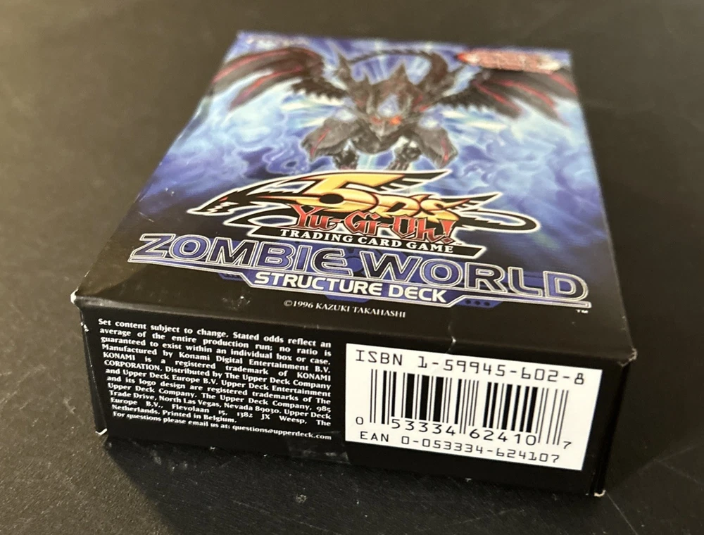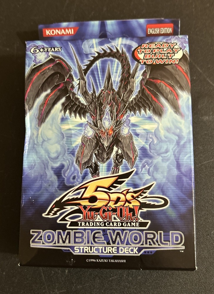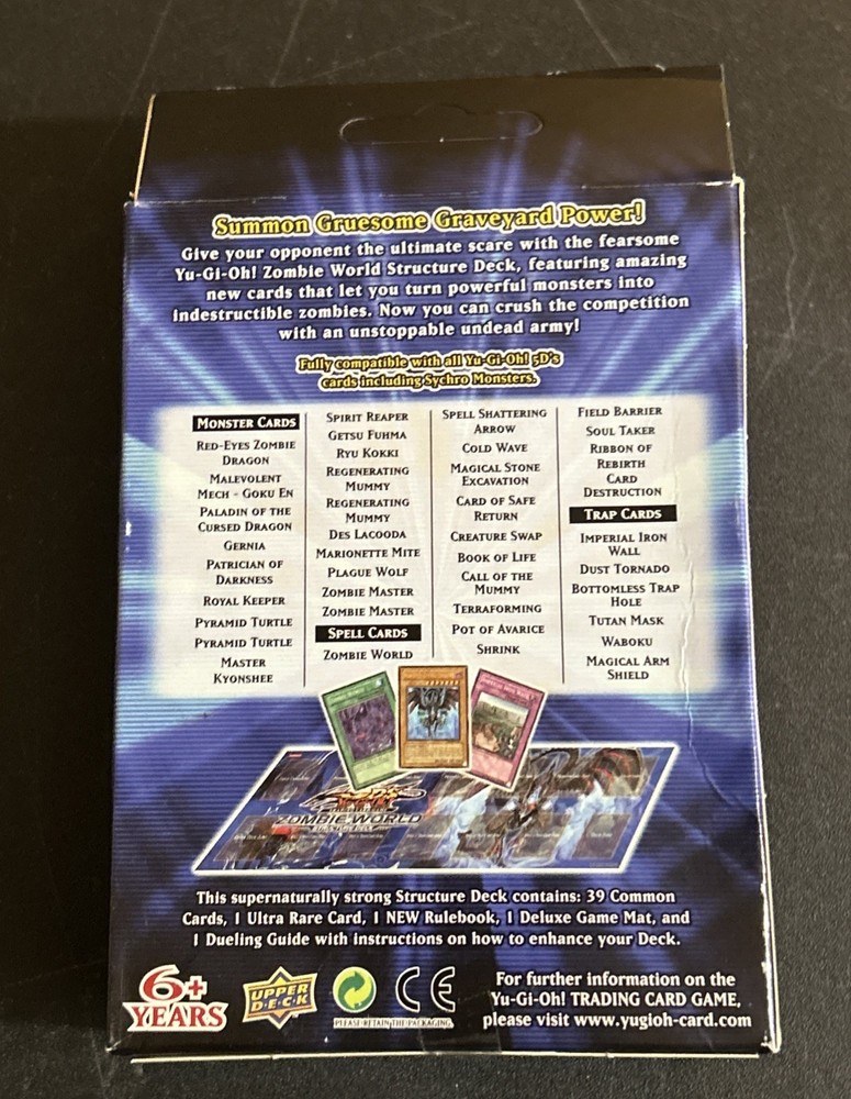 The 2008 Yugioh 5Ds Zombie World Structure Deck is a collectible card game product featuring the character "Zombie World" in English language. Manufactured by Konami in the United States, this deck comes sealed and is part of the Yu-Gi-Oh! TCG card game. With an age level of 6+, this 1st Edition Structure Deck is based on the Zombie World archetype, making it a sought-after item for Yugioh fans looking to expand their collection with a standard-sized deck. 1 trading card game structure deck as pictured and described. There is some light shelf wear on the box but it is still sealed - please see pictures for closer details! This item will ship fast and secured at the time of your purchase! If you have any additional questions or concerns about this item, please feel free to contact me directly! Thanks for looking!