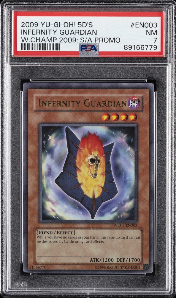 2009 YU-GI-OH! 5D'S WORLD CHAMPIONSHIP 2009: STARDUST ACCELERATOR PROMO #EN003 INFERNITY GUARDIAN PSA 7 2009 YU-GI-OH! 5D'S WORLD CHAMPIONSHIP 2009: STARDUST ACCELERATOR PROMO #EN003 INFERNITY GUARDIAN PSA 7 Purchase Info Thank you for your interest in this item consigned with PSA! By purchasing or making an offer on this item, you acknowledge and agree to the following terms: All sales are final. Returns not accepted. Payment must be made upon purchase of the item. All items are sold "as is" and without warranty of Collectors Universe, Inc. (d/b/a PSA), and ANY AND ALL IMPLIED WARRANTIES ARE DISCLAIMED AND EXCLUDED. Sales tax may apply depending on shipping address. PSA does not guarantee that another third-party grading company's authentication or certification of an item as genuine is correct or accurate. Neither a difference of opinion between third-party grading companies about authenticity, nor a company's subsequent reversal of its earlier authentication or certification of an item, will be a basis for rescinding a sale. Any dispute with another third-party grading company relating to the authenticity of an item must be resolved directly with that other company. Collectors' maximum liability in the event of loss or damage to an item during shipping will be the lesser of (a) the price paid for the item and (b) the change in fair market value of the item. You release Collectors from all other liability including for any claims of punitive damages, emotional distress, consequential damages, lost profits, or lost interest, except as prohibited by law. Shipping Purchased Items will be shipped directly from PSA Vault. You stay hands-free. PSA Vault When you purchase this item, you can save on sales tax and selling fees by keeping it in the PSA Vault, official Vault of eBay. Items already in PSA Vault and will be sent to PSA Vault will have no shipping charge Storage of any items with the PSA Vault will be subject to the PSA Vault Terms of Service. Consignment PSA has competitive rates on the world's largest collectibles marketplace with the option to list from the PSA Vault or immediately after PSA authentication and grading. Sale Price Under $100 $100 - $499 $500 - $999 $1,000 - $2,499 $2,500 - $4,999 $5,000+ Seller Fee 16% 14% 13% 10% 9% 7% Sellers pay a single fee as reflected above; no additional eBay fees are incurred. There is a $5 minimum fee on sold items.