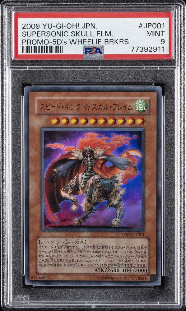 2009 YU-GI-OH! JAPANESE PROMO 5D'S WHEELIE BREAKERS #JP001 SUPERSONIC SKULL FLAME PSA 9 2009 YU-GI-OH! JAPANESE PROMO 5D'S WHEELIE BREAKERS #JP001 SUPERSONIC SKULL FLAME PSA 9 Purchase Info Thank you for your interest in this item consigned with PSA! By purchasing or making an offer on this item, you acknowledge and agree to the following terms: All sales are final. Returns not accepted. Payment must be made upon purchase of the item. All items are sold "as is" and without warranty of Collectors Universe, Inc. (d/b/a PSA), and ANY AND ALL IMPLIED WARRANTIES ARE DISCLAIMED AND EXCLUDED. Sales tax may apply depending on shipping address. PSA does not guarantee that another third-party grading company's authentication or certification of an item as genuine is correct or accurate. Neither a difference of opinion between third-party grading companies about authenticity, nor a company's subsequent reversal of its earlier authentication or certification of an item, will be a basis for rescinding a sale. Any dispute with another third-party grading company relating to the authenticity of an item must be resolved directly with that other company. Collectors' maximum liability in the event of loss or damage to an item during shipping will be the lesser of (a) the price paid for the item and (b) the change in fair market value of the item. You release Collectors from all other liability including for any claims of punitive damages, emotional distress, consequential damages, lost profits, or lost interest, except as prohibited by law. Shipping Purchased Items will be shipped directly from PSA Vault. You stay hands-free. PSA Vault When you purchase this item, you can save on sales tax and selling fees by keeping it in the PSA Vault, official Vault of eBay. Items already in PSA Vault and will be sent to PSA Vault will have no shipping charge Storage of any items with the PSA Vault will be subject to the PSA Vault Terms of Service. Consignment PSA has competitive rates on the world's largest collectibles marketplace with the option to list from the PSA Vault or immediately after PSA authentication and grading. Sale Price Under $100 $100 - $499 $500 - $999 $1,000 - $2,499 $2,500 - $4,999 $5,000+ Seller Fee 16% 14% 13% 10% 9% 7% Sellers pay a single fee as reflected above; no additional eBay fees are incurred. There is a $5 minimum fee on sold items.