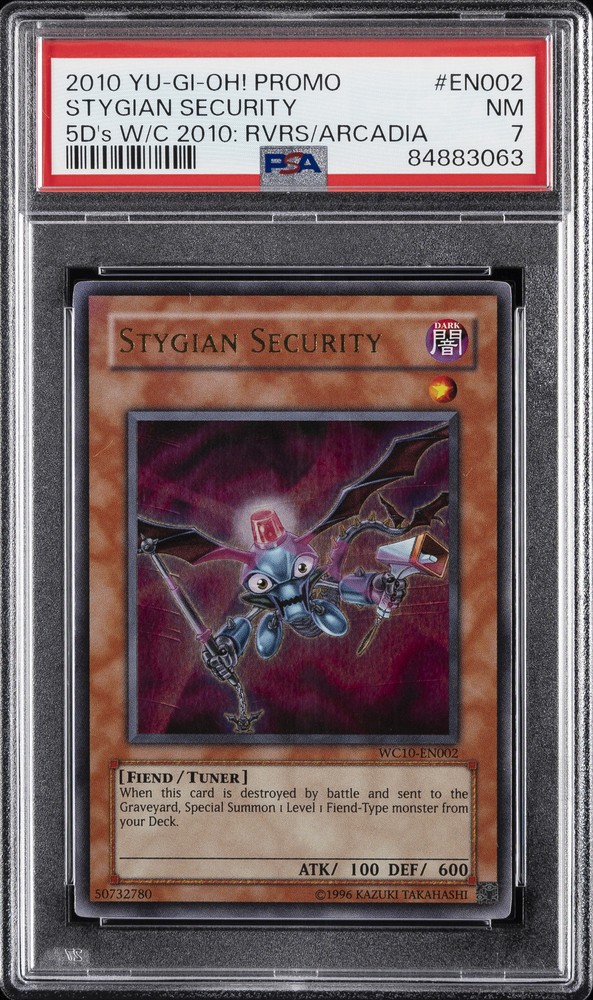 2010 YU-GI-OH! PROMO 5D'S WORLD CHAMPIONSHIP 2010: REVERSE OF ARCADIA #EN002 STYGIAN SECURITY PSA 7 2010 YU-GI-OH! PROMO 5D'S WORLD CHAMPIONSHIP 2010: REVERSE OF ARCADIA #EN002 STYGIAN SECURITY PSA 7 Purchase Info Thank you for your interest in this item consigned with PSA! By purchasing or making an offer on this item, you acknowledge and agree to the following terms: All sales are final. Returns not accepted. Payment must be made upon purchase of the item. All items are sold "as is" and without warranty of Collectors Universe, Inc. (d/b/a PSA), and ANY AND ALL IMPLIED WARRANTIES ARE DISCLAIMED AND EXCLUDED. Sales tax may apply depending on shipping address. PSA does not guarantee that another third-party grading company's authentication or certification of an item as genuine is correct or accurate. Neither a difference of opinion between third-party grading companies about authenticity, nor a company's subsequent reversal of its earlier authentication or certification of an item, will be a basis for rescinding a sale. Any dispute with another third-party grading company relating to the authenticity of an item must be resolved directly with that other company. Collectors' maximum liability in the event of loss or damage to an item during shipping will be the lesser of (a) the price paid for the item and (b) the change in fair market value of the item. You release Collectors from all other liability including for any claims of punitive damages, emotional distress, consequential damages, lost profits, or lost interest, except as prohibited by law. Shipping Purchased Items will be shipped directly from PSA Vault. You stay hands-free. PSA Vault When you purchase this item, you can save on sales tax and selling fees by keeping it in the PSA Vault, official Vault of eBay. Items already in PSA Vault and will be sent to PSA Vault will have no shipping charge Storage of any items with the PSA Vault will be subject to the PSA Vault Terms of Service. Consignment PSA has competitive rates on the world's largest collectibles marketplace with the option to list from the PSA Vault or immediately after PSA authentication and grading. Sale Price Under $100 $100 - $499 $500 - $999 $1,000 - $2,499 $2,500 - $4,999 $5,000+ Seller Fee 16% 14% 13% 10% 9% 7% Sellers pay a single fee as reflected above; no additional eBay fees are incurred. There is a $5 minimum fee on sold items.