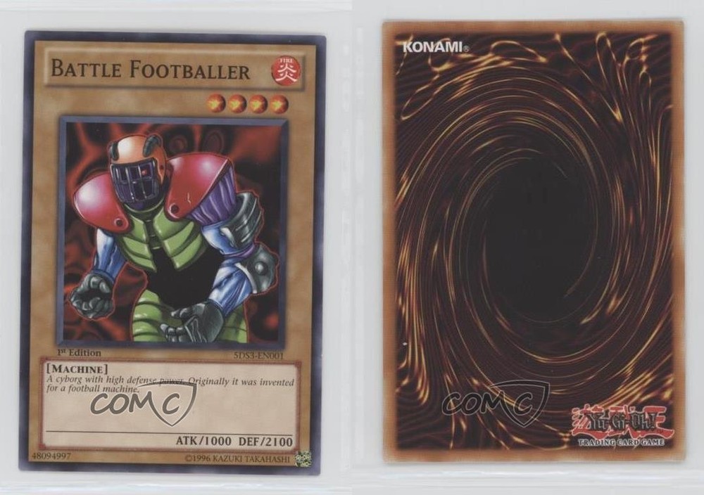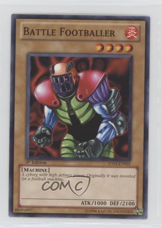 2010 Yu-Gi-Oh! 5D's Duelist Toolbox - Starter Deck [Base] - 1st Edition #5DS3-EN001 Battle Footballer COMC Item: 87500021 - YuGiOh Card - Featuring Battle Footballer Search for more: 2010 Yu-Gi-Oh! 5D's Duelist Toolbox Search for more: 2010 Yu-Gi-Oh! 5D's Duelist Toolbox - Starter Deck [Base] - 1st Edition View all of our Listings Auctions Buy It Now About Us Located in the beautiful Pacific Northwest, COMC (Check Out My Cards) is the world's largest consignment service for trading card singles. More than 10,000 people have used our consignment service to list over 50 million trading cards. Find out how we can help you consign your items on eBay by contacting us through eBay messaging. COMC -- "The Safe & Easy Way to Buy & Sell" Raw Condition for Modern Cards Unless otherwise noted, raw modern cards are listed in Near Mint-Mint condition or better. A NM-MT card appears to be Mint at first glance, but upon closer inspection, may exhibit some of the following: minor print defects (e.g. roller marks, print line, dimple), minor scratches, slight edge wear, and slight corner wear. Centering is clearly visible in the images provided and does not factor into our condition assessment. Raw Condition for Vintage Cards Unless otherwise noted, raw vintage cards are listed in Excellent condition or better. An EX card may exhibit some of the following: minor rounding of corners, surface wear, print defects, light scratches, and slight edge wear/chipping. Centering is clearly visible in the images provided and does not factor into our condition assessment. Domestic Shipping Combined shipping for multiple items is available. To receive combined shipping, please ensure all desired items are in your eBay shopping cart before proceeding to checkout. eBay limits orders to 40 items per order. We automatically combine multiple orders placed on the same day. If you place multiple orders on the same day, please contact us to request a refund of applicable shipping costs. Signature confirmation may be required on invoices over $400. All cards are protected and shipped securely. International Shipping COMC offers eBay's International Shipping (EIS) for international orders under $2,500* (see country exceptions below). All duties and import fees are paid at checkout; in the rare event that there are additional import fees upon delivery, these are borne by the buyer. EIS packages route through a shipping hub in Erlanger, KY before shipping to their final destination. Please note that EIS does not allow for combined shipments. The shipping rates are determined by eBay and cannot be adjusted. *Maximum sale price exceptions: Colombia, Kuwait ($2,000); Taiwan ($1,539); Chile, Costa Rica, Guatemala, Honduras, Trinidad and Tobago ($1,000); Antigua and Barbuda, Aruba, Belize, Dominica, Grenada, Philippines, Saint Kitts and Nevis, Saint Lucia, Montserrat, Turks and Caicos Islands ($500); Dominican Republic, El Salvador ($200). Please request a shipping quote through eBay messaging for orders that exceed the maximum sale price supported by eBay's International Shipping. You will be responsible for all duties and import fees for international orders shipped outside the EIS. All cards are protected and shipped securely. Payment COMC does not accept offers on our cards through our eBay storefront. COMC utilizes eBay’s managed payments system. If you are experiencing difficulties making a payment, please contact eBay for assistance. Return Policy Returns are only accepted on the rare occasion the item is not as described. If you are making a return, please initiate the return process through eBay so a mailing label can be provided for you. Prior to listing, our expert team carefully assessed this item to represent it accurately. Please review the description and high-definition images prior to purchasing to ensure this item meets your satisfaction. We welcome you to contact us if you have further questions about this item. Trust and Integrity COMC carefully assesses each item consigned to us to prevent fraudulent items from entering the marketplace. If you believe an item offered on COMC may be fraudulent, please contact us with details so we can investigate the issue. Items we determine are outside our supported items policy may be removed. Last Modified: 6/12/2025 6:42:55 PM PDT