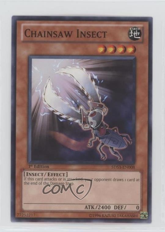 2010 Yu-Gi-Oh! 5D's Duelist Toolbox - Starter Deck [Base] - 1st Edition #5DS3-EN008 Chainsaw Insect COMC Item: 87499949 - YuGiOh Card - Featuring Chainsaw Insect Search for more: 2010 Yu-Gi-Oh! 5D's Duelist Toolbox Search for more: 2010 Yu-Gi-Oh! 5D's Duelist Toolbox - Starter Deck [Base] - 1st Edition View all of our Listings Auctions Buy It Now About Us Located in the beautiful Pacific Northwest, COMC (Check Out My Cards) is the world's largest consignment service for trading card singles. More than 10,000 people have used our consignment service to list over 50 million trading cards. Find out how we can help you consign your items on eBay by contacting us through eBay messaging. COMC -- "The Safe & Easy Way to Buy & Sell" Raw Condition for Modern Cards Unless otherwise noted, raw modern cards are listed in Near Mint-Mint condition or better. A NM-MT card appears to be Mint at first glance, but upon closer inspection, may exhibit some of the following: minor print defects (e.g. roller marks, print line, dimple), minor scratches, slight edge wear, and slight corner wear. Centering is clearly visible in the images provided and does not factor into our condition assessment. Raw Condition for Vintage Cards Unless otherwise noted, raw vintage cards are listed in Excellent condition or better. An EX card may exhibit some of the following: minor rounding of corners, surface wear, print defects, light scratches, and slight edge wear/chipping. Centering is clearly visible in the images provided and does not factor into our condition assessment. Domestic Shipping Combined shipping for multiple items is available. To receive combined shipping, please ensure all desired items are in your eBay shopping cart before proceeding to checkout. eBay limits orders to 40 items per order. We automatically combine multiple orders placed on the same day. If you place multiple orders on the same day, please contact us to request a refund of applicable shipping costs. Signature confirmation may be required on invoices over $400. All cards are protected and shipped securely. International Shipping COMC offers eBay's International Shipping (EIS) for international orders under $2,500* (see country exceptions below). All duties and import fees are paid at checkout; in the rare event that there are additional import fees upon delivery, these are borne by the buyer. EIS packages route through a shipping hub in Erlanger, KY before shipping to their final destination. Please note that EIS does not allow for combined shipments. The shipping rates are determined by eBay and cannot be adjusted. *Maximum sale price exceptions: Colombia, Kuwait ($2,000); Taiwan ($1,539); Chile, Costa Rica, Guatemala, Honduras, Trinidad and Tobago ($1,000); Antigua and Barbuda, Aruba, Belize, Dominica, Grenada, Philippines, Saint Kitts and Nevis, Saint Lucia, Montserrat, Turks and Caicos Islands ($500); Dominican Republic, El Salvador ($200). Please request a shipping quote through eBay messaging for orders that exceed the maximum sale price supported by eBay's International Shipping. You will be responsible for all duties and import fees for international orders shipped outside the EIS. All cards are protected and shipped securely. Payment COMC does not accept offers on our cards through our eBay storefront. COMC utilizes eBay’s managed payments system. If you are experiencing difficulties making a payment, please contact eBay for assistance. Return Policy Returns are only accepted on the rare occasion the item is not as described. If you are making a return, please initiate the return process through eBay so a mailing label can be provided for you. Prior to listing, our expert team carefully assessed this item to represent it accurately. Please review the description and high-definition images prior to purchasing to ensure this item meets your satisfaction. We welcome you to contact us if you have further questions about this item. Trust and Integrity COMC carefully assesses each item consigned to us to prevent fraudulent items from entering the marketplace. If you believe an item offered on COMC may be fraudulent, please contact us with details so we can investigate the issue. Items we determine are outside our supported items policy may be removed. Last Modified: 6/27/2025 3:06:37 AM PDT