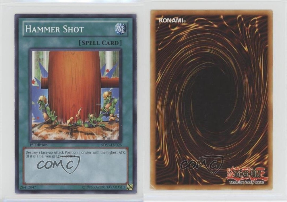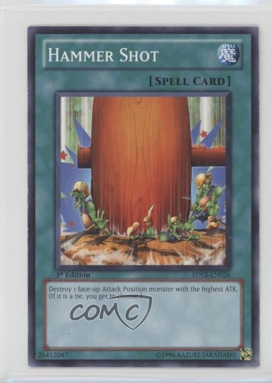 2010 Yu-Gi-Oh! 5D's Duelist Toolbox - Starter Deck [Base] - 1st Edition #5DS3-EN026 Hammer Shot COMC Item: 32077825 - YuGiOh Card - Featuring Hammer Shot Search for more: 2010 Yu-Gi-Oh! 5D's Duelist Toolbox Search for more: 2010 Yu-Gi-Oh! 5D's Duelist Toolbox - Starter Deck [Base] - 1st Edition View all of our Listings Auctions Buy It Now About Us Located in the beautiful Pacific Northwest, COMC (Check Out My Cards) is the world's largest consignment service for trading card singles. More than 10,000 people have used our consignment service to list over 50 million trading cards. Find out how we can help you consign your items on eBay by contacting us through eBay messaging. COMC -- "The Safe & Easy Way to Buy & Sell" Raw Condition for Modern Cards Unless otherwise noted, raw modern cards are listed in Near Mint-Mint condition or better. A NM-MT card appears to be Mint at first glance, but upon closer inspection, may exhibit some of the following: minor print defects (e.g. roller marks, print line, dimple), minor scratches, slight edge wear, and slight corner wear. Centering is clearly visible in the images provided and does not factor into our condition assessment. Raw Condition for Vintage Cards Unless otherwise noted, raw vintage cards are listed in Excellent condition or better. An EX card may exhibit some of the following: minor rounding of corners, surface wear, print defects, light scratches, and slight edge wear/chipping. Centering is clearly visible in the images provided and does not factor into our condition assessment. Domestic Shipping Combined shipping for multiple items is available. To receive combined shipping, please ensure all desired items are in your eBay shopping cart before proceeding to checkout. eBay limits orders to 40 items per order. We automatically combine multiple orders placed on the same day. If you place multiple orders on the same day, please contact us to request a refund of applicable shipping costs. Signature confirmation may be required on invoices over $400. All cards are protected and shipped securely. International Shipping COMC offers eBay's International Shipping (EIS) for international orders under $2,500* (see country exceptions below). All duties and import fees are paid at checkout; in the rare event that there are additional import fees upon delivery, these are borne by the buyer. EIS packages route through a shipping hub in Erlanger, KY before shipping to their final destination. Please note that EIS does not allow for combined shipments. The shipping rates are determined by eBay and cannot be adjusted. *Maximum sale price exceptions: Colombia, Kuwait ($2,000); Taiwan ($1,539); Chile, Costa Rica, Guatemala, Honduras, Trinidad and Tobago ($1,000); Antigua and Barbuda, Aruba, Belize, Dominica, Grenada, Philippines, Saint Kitts and Nevis, Saint Lucia, Montserrat, Turks and Caicos Islands ($500); Dominican Republic, El Salvador ($200). Please request a shipping quote through eBay messaging for orders that exceed the maximum sale price supported by eBay's International Shipping. You will be responsible for all duties and import fees for international orders shipped outside the EIS. All cards are protected and shipped securely. Payment COMC does not accept offers on our cards through our eBay storefront. COMC utilizes eBay’s managed payments system. If you are experiencing difficulties making a payment, please contact eBay for assistance. Return Policy Returns are only accepted on the rare occasion the item is not as described. If you are making a return, please initiate the return process through eBay so a mailing label can be provided for you. Prior to listing, our expert team carefully assessed this item to represent it accurately. Please review the description and high-definition images prior to purchasing to ensure this item meets your satisfaction. We welcome you to contact us if you have further questions about this item. Trust and Integrity COMC carefully assesses each item consigned to us to prevent fraudulent items from entering the marketplace. If you believe an item offered on COMC may be fraudulent, please contact us with details so we can investigate the issue. Items we determine are outside our supported items policy may be removed. Last Modified: 6/15/2025 9:55:24 PM PDT