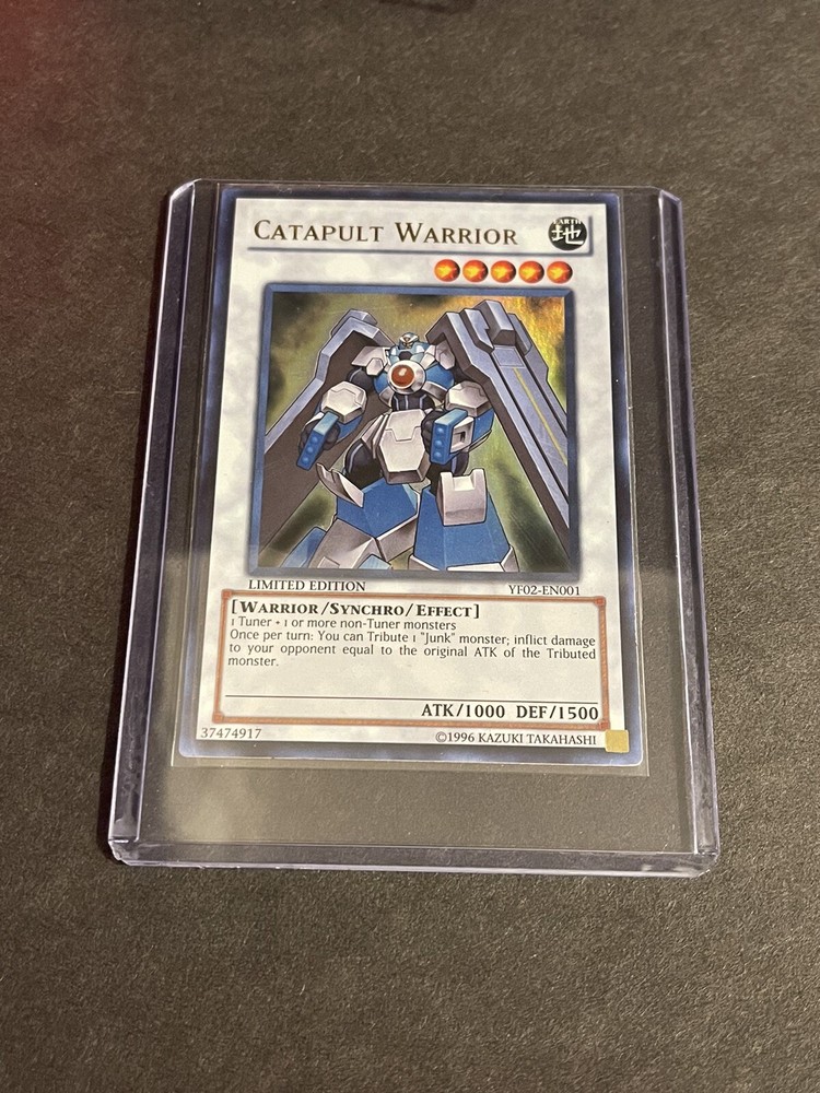 This rare and limited edition 2012 Yu-Gi-Oh! 5D's card features the powerful Catapult Warrior, ready to take on any opponent. The card is a single-insert and bears the card name "Catapult Warrior" with the code #YF02-EN001. It is an original Konami product and manufactured in 2012. The card is perfect for any YuGiOh collector and fan of the game. It is part of the -Yugi- set and is ungraded, making it a valuable addition to any collection. Don't miss your chance to own this amazing card! Shipped in soft sleeve and top loader.