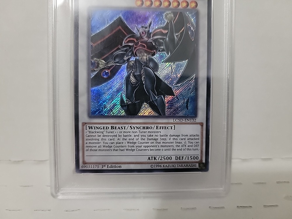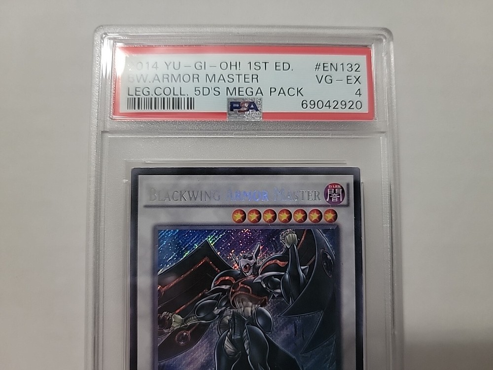 This 2014 Yu-Gi-Oh! card features the Blackwing Armor Master character and is from the Legendary Collection 5D's set. It has a Secret Rare rarity and is graded as a PSA 4, with a VG-EX condition. The card is a 1st Edition and features a foil finish. Ideal for collectors of all ages, this English language card is perfect for fans of the Yu-Gi-Oh! TCG. Its Creature/Monster Type is a Winged Beast, with a Card Type of Synchro and a Card Number of LC5D-EN132. The manufacturer is Konami and it has been certified with the Certification Number 69042920 by Professional Sports Authenticator (PSA).