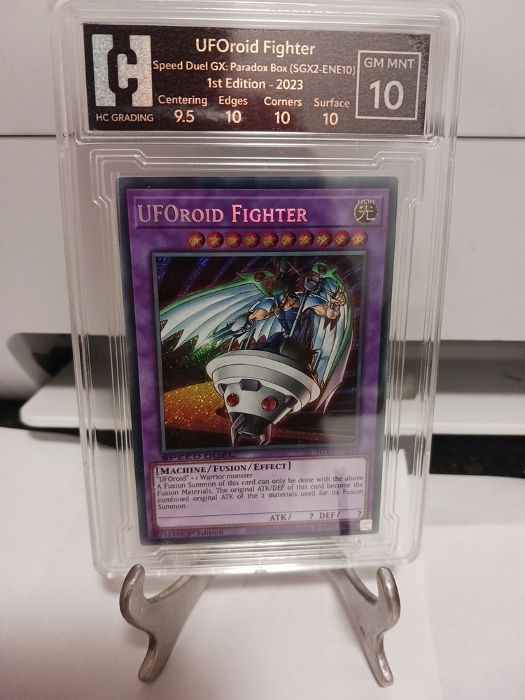 This is a rare and highly sought-after card from the 2020 Legendary Duelists set. The UFORoid Fighter is a powerful creature with special abilities that make it a valuable addition to any duelist's deck. The card is in excellent condition and has been professionally graded with a grade of 10. The card features a stunning holographic finish and is a 1st edition with a secret rare rarity. It is perfect for collectors and players alike, and its age level of 8+ makes it suitable for younger players as well. This card is a must-have for fans of Yugioh and the Dark Magician character.