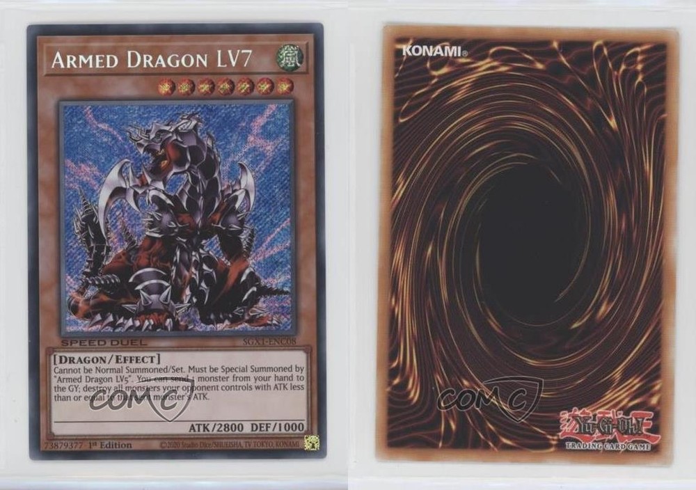2022 Yu-Gi-Oh! Speed Duel GX: Duel Academy Box - [Base] - 1st Edition #SGX1-ENC08 Armed Dragon LV7 COMC Item: 125112123 - YuGiOh Card - Featuring Armed Dragon LV7 Search for more: 2022 Yu-Gi-Oh! Speed Duel GX: Duel Academy Box Search for more: 2022 Yu-Gi-Oh! Speed Duel GX: Duel Academy Box - [Base] - 1st Edition View all of our Listings Auctions Buy It Now About Us Located in the beautiful Pacific Northwest, COMC (Check Out My Cards) is the world's largest consignment service for trading card singles. More than 10,000 people have used our consignment service to list over 50 million trading cards. Find out how we can help you consign your items on eBay by contacting us through eBay messaging. COMC -- "The Safe & Easy Way to Buy & Sell" Raw Condition for Modern Cards Unless otherwise noted, raw modern cards are listed in Near Mint-Mint condition or better. A NM-MT card appears to be Mint at first glance, but upon closer inspection, may exhibit some of the following: minor print defects (e.g. roller marks, print line, dimple), minor scratches, slight edge wear, and slight corner wear. Centering is clearly visible in the images provided and does not factor into our condition assessment. Raw Condition for Vintage Cards Unless otherwise noted, raw vintage cards are listed in Excellent condition or better. An EX card may exhibit some of the following: minor rounding of corners, surface wear, print defects, light scratches, and slight edge wear/chipping. Centering is clearly visible in the images provided and does not factor into our condition assessment. Domestic Shipping Combined shipping for multiple items is available. To receive combined shipping, please ensure all desired items are in your eBay shopping cart before proceeding to checkout. eBay limits orders to 40 items per order. We automatically combine multiple orders placed on the same day. If you place multiple orders on the same day, please contact us to request a refund of applicable shipping costs. Signature confirmation may be required on invoices over $400. All cards are protected and shipped securely. International Shipping COMC offers eBay's International Shipping (EIS) for international orders under $2,500* (see country exceptions below). All duties and import fees are paid at checkout; in the rare event that there are additional import fees upon delivery, these are borne by the buyer. EIS packages route through a shipping hub in Erlanger, KY before shipping to their final destination. Please note that EIS does not allow for combined shipments. The shipping rates are determined by eBay and cannot be adjusted. *Maximum sale price exceptions: Colombia, Kuwait ($2,000); Taiwan ($1,539); Chile, Costa Rica, Guatemala, Honduras, Trinidad and Tobago ($1,000); Antigua and Barbuda, Aruba, Belize, Dominica, Grenada, Philippines, Saint Kitts and Nevis, Saint Lucia, Montserrat, Turks and Caicos Islands ($500); Dominican Republic, El Salvador ($200). Please request a shipping quote through eBay messaging for orders that exceed the maximum sale price supported by eBay's International Shipping. You will be responsible for all duties and import fees for international orders shipped outside the EIS. All cards are protected and shipped securely. Payment COMC does not accept offers on our cards through our eBay storefront. COMC utilizes eBay’s managed payments system. If you are experiencing difficulties making a payment, please contact eBay for assistance. Return Policy Returns are only accepted on the rare occasion the item is not as described. If you are making a return, please initiate the return process through eBay so a mailing label can be provided for you. Prior to listing, our expert team carefully assessed this item to represent it accurately. Please review the description and high-definition images prior to purchasing to ensure this item meets your satisfaction. We welcome you to contact us if you have further questions about this item. Trust and Integrity COMC carefully assesses each item consigned to us to prevent fraudulent items from entering the marketplace. If you believe an item offered on COMC may be fraudulent, please contact us with details so we can investigate the issue. Items we determine are outside our supported items policy may be removed. Last Modified: 6/24/2025 3:10:48 PM PDT