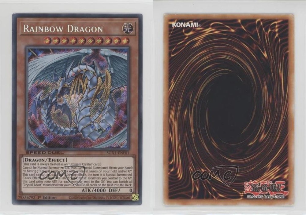 2022 Yu-Gi-Oh! Speed Duel GX: Duel Academy Box - [Base] - 1st Edition #SGX1-ENF01 Rainbow Dragon COMC Item: 128383981 - YuGiOh Card - Featuring Rainbow Dragon Search for more: 2022 Yu-Gi-Oh! Speed Duel GX: Duel Academy Box Search for more: 2022 Yu-Gi-Oh! Speed Duel GX: Duel Academy Box - [Base] - 1st Edition View all of our Listings Auctions Buy It Now About Us Located in the beautiful Pacific Northwest, COMC (Check Out My Cards) is the world's largest consignment service for trading card singles. More than 10,000 people have used our consignment service to list over 50 million trading cards. Find out how we can help you consign your items on eBay by contacting us through eBay messaging. COMC -- "The Safe & Easy Way to Buy & Sell" Raw Condition for Modern Cards Unless otherwise noted, raw modern cards are listed in Near Mint-Mint condition or better. A NM-MT card appears to be Mint at first glance, but upon closer inspection, may exhibit some of the following: minor print defects (e.g. roller marks, print line, dimple), minor scratches, slight edge wear, and slight corner wear. Centering is clearly visible in the images provided and does not factor into our condition assessment. Raw Condition for Vintage Cards Unless otherwise noted, raw vintage cards are listed in Excellent condition or better. An EX card may exhibit some of the following: minor rounding of corners, surface wear, print defects, light scratches, and slight edge wear/chipping. Centering is clearly visible in the images provided and does not factor into our condition assessment. Domestic Shipping Combined shipping for multiple items is available. To receive combined shipping, please ensure all desired items are in your eBay shopping cart before proceeding to checkout. eBay limits orders to 40 items per order. We automatically combine multiple orders placed on the same day. If you place multiple orders on the same day, please contact us to request a refund of applicable shipping costs. Signature confirmation may be required on invoices over $400. All cards are protected and shipped securely. International Shipping COMC offers eBay's International Shipping (EIS) for international orders under $2,500* (see country exceptions below). All duties and import fees are paid at checkout; in the rare event that there are additional import fees upon delivery, these are borne by the buyer. EIS packages route through a shipping hub in Erlanger, KY before shipping to their final destination. Please note that EIS does not allow for combined shipments. The shipping rates are determined by eBay and cannot be adjusted. *Maximum sale price exceptions: Colombia, Kuwait ($2,000); Taiwan ($1,539); Chile, Costa Rica, Guatemala, Honduras, Trinidad and Tobago ($1,000); Antigua and Barbuda, Aruba, Belize, Dominica, Grenada, Philippines, Saint Kitts and Nevis, Saint Lucia, Montserrat, Turks and Caicos Islands ($500); Dominican Republic, El Salvador ($200). Please request a shipping quote through eBay messaging for orders that exceed the maximum sale price supported by eBay's International Shipping. You will be responsible for all duties and import fees for international orders shipped outside the EIS. All cards are protected and shipped securely. Payment COMC does not accept offers on our cards through our eBay storefront. COMC utilizes eBay’s managed payments system. If you are experiencing difficulties making a payment, please contact eBay for assistance. Return Policy Returns are only accepted on the rare occasion the item is not as described. If you are making a return, please initiate the return process through eBay so a mailing label can be provided for you. Prior to listing, our expert team carefully assessed this item to represent it accurately. Please review the description and high-definition images prior to purchasing to ensure this item meets your satisfaction. We welcome you to contact us if you have further questions about this item. Trust and Integrity COMC carefully assesses each item consigned to us to prevent fraudulent items from entering the marketplace. If you believe an item offered on COMC may be fraudulent, please contact us with details so we can investigate the issue. Items we determine are outside our supported items policy may be removed. Last Modified: 6/23/2025 10:22:32 PM PDT