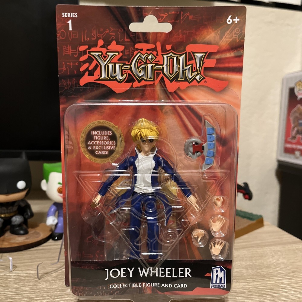 Get ready to duel with this 4-inch PhatMojo action figure of Joey Wheeler, a beloved character from the Yu-Gi-Oh! TV show and movie franchise. This highly-detailed figure is 5-way jointed and comes boxed and unopened in its original packaging. It also includes an exclusive card that is sure to impress any fan of the series. Constructed from high-quality vinyl and plastic materials, this action figure is built to last and is suitable for children aged 5-7 years old. It features adjustable parts and is a 1st edition release. Add this original and licensed figure to your collection today and relive the epic battles of Joey Wheeler alongside your other favorite Yu-Gi-Oh! characters.