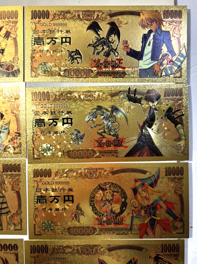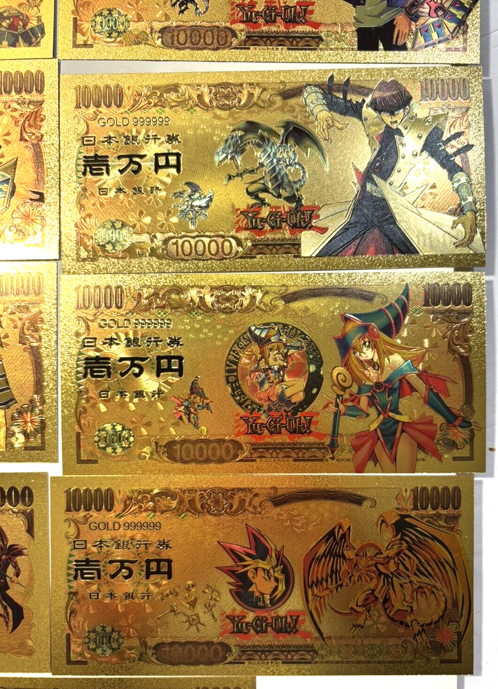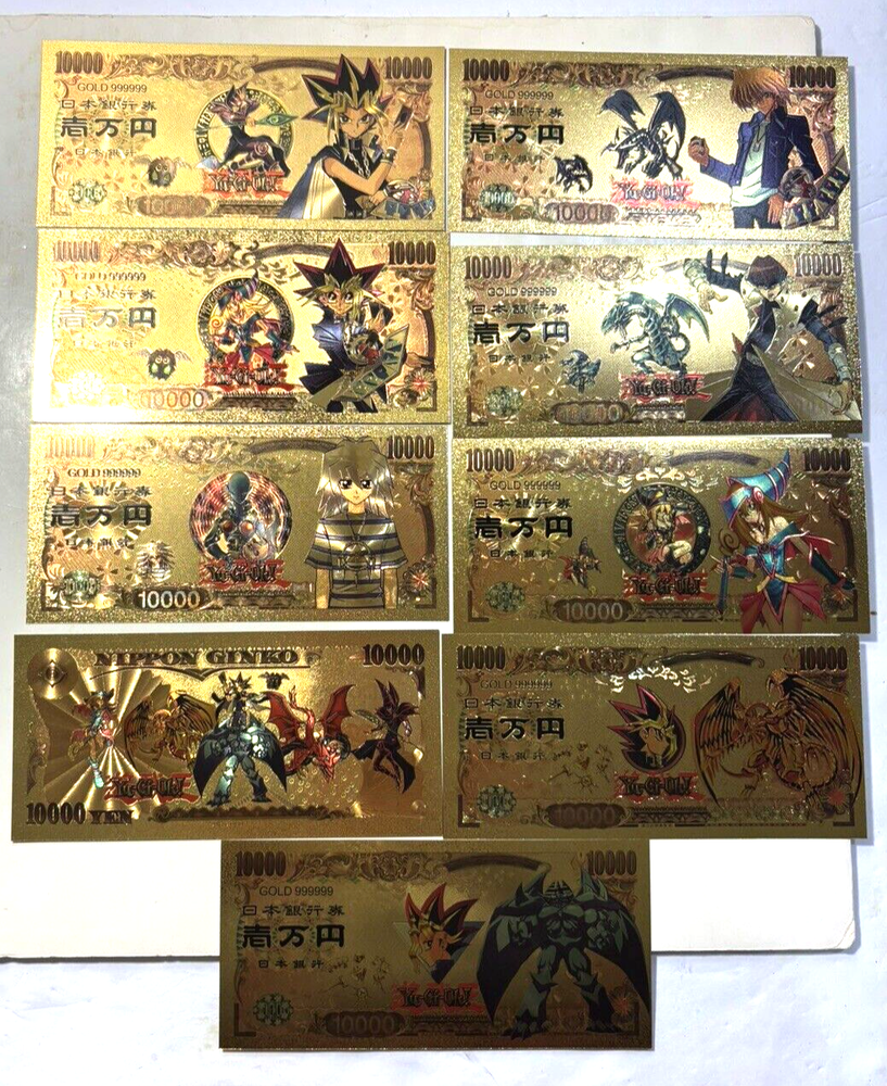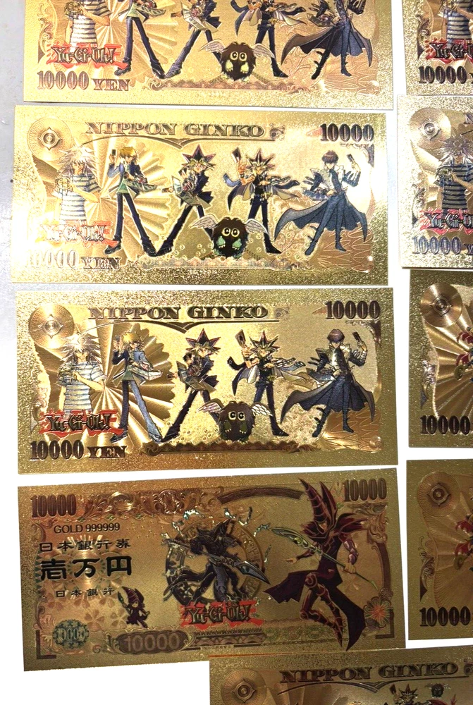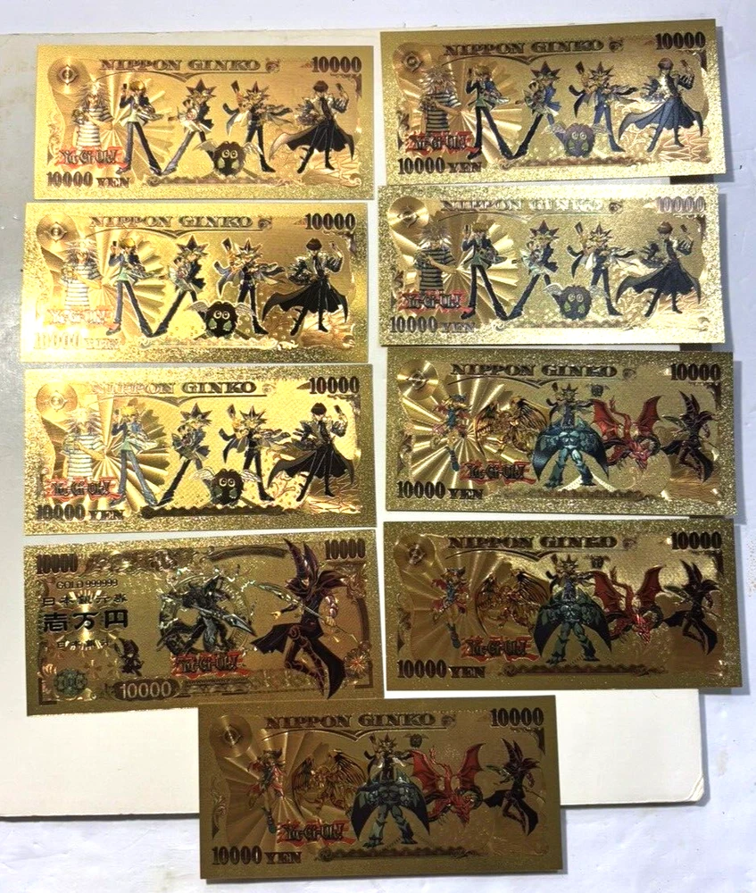 24k Gold Foil Plated Yu-Gi-Oh Banknote Set Anime Collectible cards set, set of 9, very nice condition .not real currency . looks like little or no play . questions? please ask. thanks for looking....