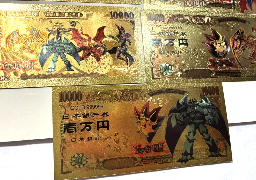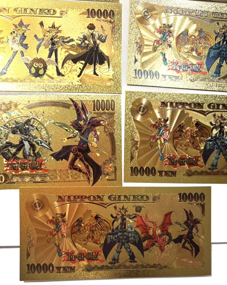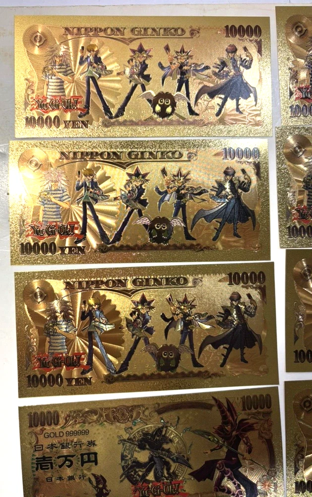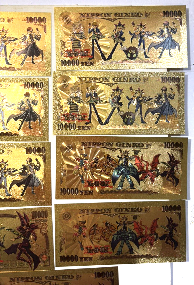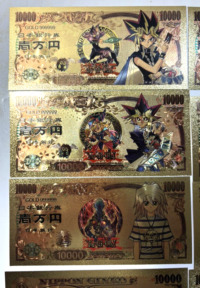 24k Gold Foil Plated Yu-Gi-Oh Banknote Set Anime Collectible cards set, set of 9, very nice condition .not real currency . looks like little or no play . questions? please ask. thanks for looking....