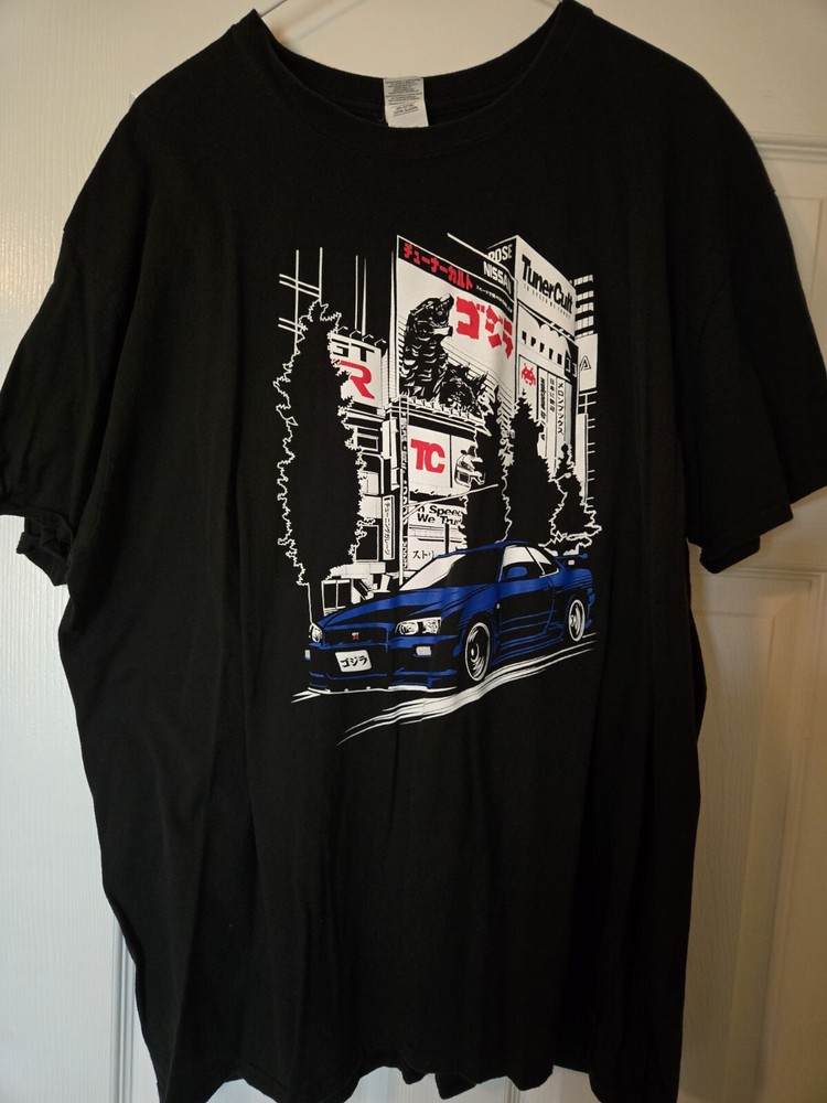 This is a 2XL black Nissan Skyline Godzilla t-shirt featuring the iconic R32, R33, R34, and R35 GTR models. Made from cotton with a crew neck and short sleeves, it is machine washable and has a regular fit. The shirt is part of the Tunercult collection and showcases the Godzilla character family, reflecting a theme of cars. This officially licensed Nissan product is from the 2010-2019 era and was manufactured in the United States.