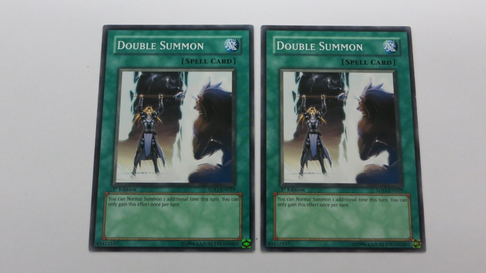 Welcome to Great_Deals_On_Collectibles.We are in the retail hobby sector and have been since 1991.We sell sportscards,gaming cards,comic books,action figures,plush toys and various other hobby related items.We have been on Ebay since 1999.We try to make buyers experience on EBAY as satisfying as possible.Our feedback on Ebay speaks volumes.Every item we have up for auction is LIVE and ready to be shipped upon payment. If you have any questions feel free to contact us,thanks for showing interest. YUGIOH You are bidding on 2x DOUBLE SUMMON SPELL CARD 5DS1-EN029 1ST EDITION COMMON YUGIOH NM UNPLAYED