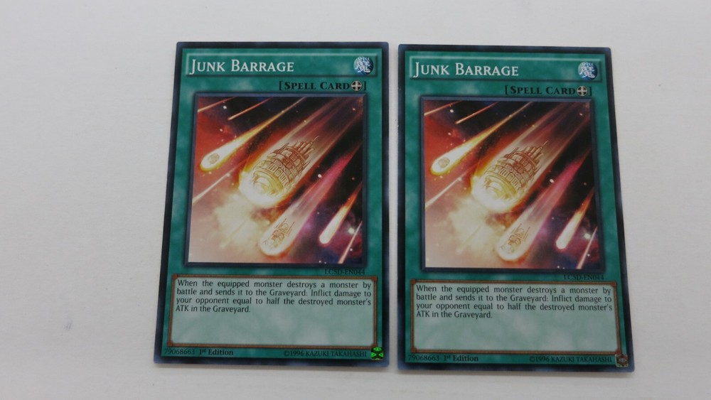Welcome to Great_Deals_On_Collectibles.We are in the retail hobby sector and have been since 1991.We sell sportscards,gaming cards,comic books,action figures,plush toys and various other hobby related items.We have been on Ebay since 1999.We try to make buyers experience on EBAY as satisfying as possible.Our feedback on Ebay speaks volumes.Every item we have up for auction is LIVE and ready to be shipped upon payment. If you have any questions feel free to contact us,thanks for showing interest. YUGIOH You are bidding on 2x JUNK BARRAGE SPELL CARD 1ST EDITION LC5D-EN044 COMMON YUGIOH NM / UNPLAYED