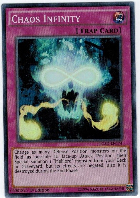 PICTURE IN LISTING IS ONLY FOR EXAMPLE ,it is a stock picture. Item condition is listed as "Used" because Ebay requires UPC codes for any item that is listed as "New", and trading cards do not have UPC Codes, so they must be listed as "Used". Card condition is listed in the listing title and in the item description. Rarity and edition of the card are described in the listing title and description. From this listing you will receive 3 card(s) for each purchase Description Set : Legendary Collection 5D's Name : Chaos Infinity Number : LC5D-EN174 Rarity : Super Rare Condition : Near Mint Language : English We get your package in the mail quickly, please rate our service based on how quickly we gave your package to the post office. Not on how long it took the post office to deliver it. As we all know we cannot control that. If you have concerns about our shipping service, please send us a message and we will gladly talk to you about it and explain it. Domestic Buyers: Domestic orders within the United States are shipped for one flat rate, no cost for additional cards purchased on the same invoice. International Buyers: International orders are shipped First Class Mail International with and an additional item fee of $0.50. Orders over $50.00 USD require additional postage fees because of shipping method changes. SPECIAL REQUIREMENTS For International Orders Any International order greater than $100.00 USD will require shipment by : USPS Global Express Mail This is a flat rate service and you may ship cards totaling up to 16 ounces, the weight limit on the package. The following International Countries can request USPS First Class Mail International Package as the shipment method for orders over $50.00 USD as this service provides electronic tracking to these countries. This service is more expensive than the normal USPS First Class Mail International service, but cheaper than USPS Priority Mail International. Australia Gibraltar Netherlands Belgium Great Britain New Zealand Canada Hungary Northern Ireland Croatia Israel Portugal Denmark Latvia Singapore Estonia Lithuania Spain Finland Luxembourg Switzerland France Malaysia Germany Malta Special Handling of International orders : We reserve the right to hold and/or cancel any International order in which it appears the buyer is attempting to circumvent our Global Express shipping requirements by breaking up larger purchases into smaller orders. Orders made within a 30 day window and having previous orders that have not yet been acknowledged as received, via Feedback and Ebay messages will be subject to this condition and may be held until all previous orders have been acknowledged as received. International Buyers – Please Note: Import duties, taxes and charges are not included in the item price or shipping charges. These charges are the buyer's responsibility. Please check with your country's customs office to determine what these additional costs will be prior to bidding/buying. SHIPPING: Every attempt is made to send your item out within 1 business day of receipt of payment. Check our feedback! Pre-sell items are shipped within 1 business day of us getting merchandise in hand. Default Shipping Methods: Domestic Orders: Shipped First Class Mail Cards will be shipped with a Hard Sleeve and/or a Soft Sleeve for protection in accordance with eBay's standard envelope policy. International Orders: Shipped First Class Mail International Cards will be shipped with a Hard Sleeve and/or a Soft Sleeve for protection in accordance with eBay's standard envelope policy. We use all new and clean products to package your cards. If you have any questions, please do not hesitate to ask!