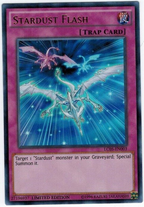 PICTURE IN LISTING IS ONLY FOR EXAMPLE ,it is a stock picture. Item condition is listed as "Used" because Ebay requires UPC codes for any item that is listed as "New", and trading cards do not have UPC Codes, so they must be listed as "Used". Card condition is listed in the listing title and in the item description. Rarity and edition of the card are described in the listing title and description. From this listing you will receive 3 card(s) for each purchase Description Set : Legendary Collection 5D's Name : Stardust Flash Number : LC05-EN003 Rarity : Ultra Rare Condition : Near Mint Language : English We get your package in the mail quickly, please rate our service based on how quickly we gave your package to the post office. Not on how long it took the post office to deliver it. As we all know we cannot control that. If you have concerns about our shipping service, please send us a message and we will gladly talk to you about it and explain it. Domestic Buyers: Domestic orders within the United States are shipped for one flat rate, no cost for additional cards purchased on the same invoice. International Buyers: International orders are shipped First Class Mail International with and an additional item fee of $0.50. Orders over $50.00 USD require additional postage fees because of shipping method changes. SPECIAL REQUIREMENTS For International Orders Any International order greater than $100.00 USD will require shipment by : USPS Global Express Mail This is a flat rate service and you may ship cards totaling up to 16 ounces, the weight limit on the package. The following International Countries can request USPS First Class Mail International Package as the shipment method for orders over $50.00 USD as this service provides electronic tracking to these countries. This service is more expensive than the normal USPS First Class Mail International service, but cheaper than USPS Priority Mail International. Australia Gibraltar Netherlands Belgium Great Britain New Zealand Canada Hungary Northern Ireland Croatia Israel Portugal Denmark Latvia Singapore Estonia Lithuania Spain Finland Luxembourg Switzerland France Malaysia Germany Malta Special Handling of International orders : We reserve the right to hold and/or cancel any International order in which it appears the buyer is attempting to circumvent our Global Express shipping requirements by breaking up larger purchases into smaller orders. Orders made within a 30 day window and having previous orders that have not yet been acknowledged as received, via Feedback and Ebay messages will be subject to this condition and may be held until all previous orders have been acknowledged as received. International Buyers – Please Note: Import duties, taxes and charges are not included in the item price or shipping charges. These charges are the buyer's responsibility. Please check with your country's customs office to determine what these additional costs will be prior to bidding/buying. SHIPPING: Every attempt is made to send your item out within 1 business day of receipt of payment. Check our feedback! Pre-sell items are shipped within 1 business day of us getting merchandise in hand. Default Shipping Methods: Domestic Orders: Shipped First Class Mail Cards will be shipped with a Hard Sleeve and/or a Soft Sleeve for protection in accordance with eBay's standard envelope policy. International Orders: Shipped First Class Mail International Cards will be shipped with a Hard Sleeve and/or a Soft Sleeve for protection in accordance with eBay's standard envelope policy. We use all new and clean products to package your cards. If you have any questions, please do not hesitate to ask!
