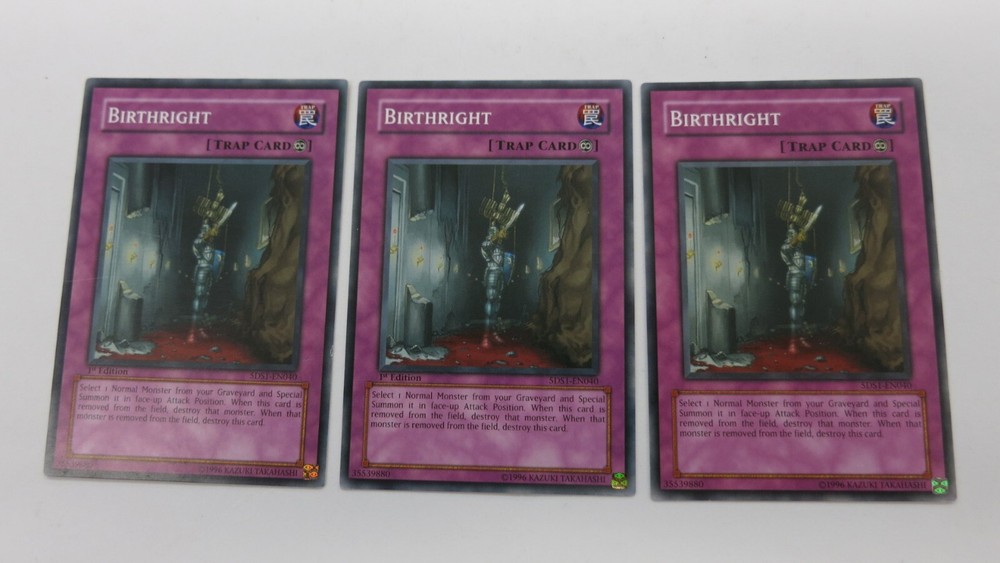 Welcome to Great_Deals_On_Collectibles.We are in the retail hobby sector and have been since 1991.We sell sportscards,gaming cards,comic books,action figures,plush toys and various other hobby related items.We have been on Ebay since 1999.We try to make buyers experience on EBAY as satisfying as possible.Our feedback on Ebay speaks volumes.Every item we have up for auction is LIVE and ready to be shipped upon payment. If you have any questions feel free to contact us,thanks for showing interest. YUGIOH You are bidding on 3x ( 2x 1ST / 1x UNL ) BIRTHRIGHT 5DS1-EN040 TRAP CARD COMMON YUGIOH NM