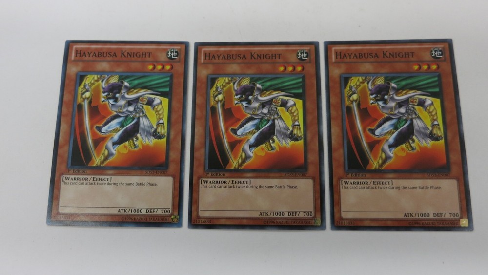 Welcome to Great_Deals_On_Collectibles.We are in the retail hobby sector and have been since 1991.We sell sportscards,gaming cards,comic books,action figures,plush toys and various other hobby related items.We have been on Ebay since 1999.We try to make buyers experience on EBAY as satisfying as possible.Our feedback on Ebay speaks volumes.Every item we have up for auction is LIVE and ready to be shipped upon payment. If you have any questions feel free to contact us,thanks for showing interest. YUGIOH You are bidding on 3x HAYABUSA KNIGHT PLAYSET 5DS3-EN007 1ST EDITION COMMON YUGIOH NM