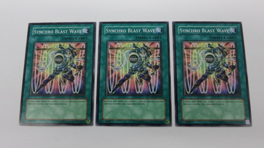 Welcome to Great_Deals_On_Collectibles.We are in the retail hobby sector and have been since 1991.We sell sportscards,gaming cards,comic books,action figures,plush toys and various other hobby related items.We have been on Ebay since 1999.We try to make buyers experience on EBAY as satisfying as possible.Our feedback on Ebay speaks volumes.Every item we have up for auction is LIVE and ready to be shipped upon payment. If you have any questions feel free to contact us,thanks for showing interest. YUGIOH You are bidding on 3x SYNCHRO BLAST WAVE SPELL 5DS1-EN021 UNLIMITED ED COMMON YUGIOH NM UNPLAYED