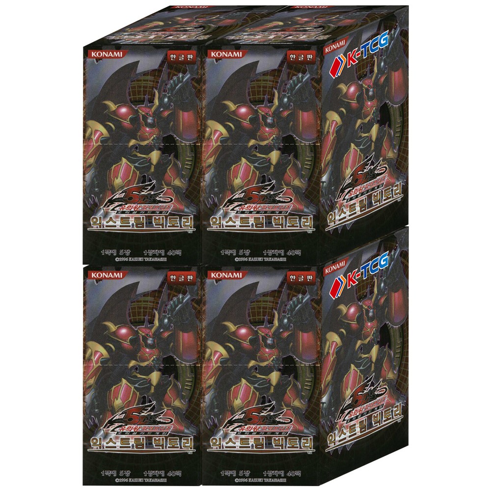 4 x Yugioh 5ds Cards "Extreme Victory" Booster Box EXVC-KR Korean Ver *Notice* If you would like to purchase in bulk, please contact us via eBay message. Product Features Net 4 Booster Box 1 Booster Box = 40 Booster Packs ( 5 Random Cards per a Pack) Genuine Korean version (100% Original Items of Konami) SHIPPING Policy Standard shipping takes about 10-15 business days. (Tracking package) Expedited shipping takes about 2-7 business days. (Tracking package) TAX&CUSTOMS The policy of customs clearance may differ form each country. We are not responsible for any applicable customs charge, taxes and duties. Import duties & tax charges are buyer's responsibility. Please check with your country's customs office to determine what these additional costs will be prior to bidding or buying . If you have any problem, please contact us via eBay message.
