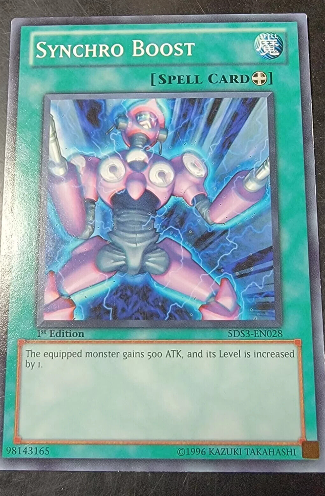 This A938 Yu-Gi-Oh! Spell Card Synchro Boost 5DS3-EN028 is a must-have for any collector or player of the game. With its vibrant green color and iconic design, this card is sure to stand out in your collection. Made from high-quality card stock, it is durable and perfect for display or use in gameplay. This card is suitable for players aged 6 and above, and is part of the popular Yu-Gi-Oh! franchise. Manufactured by Konami in 1996, it is a vintage item that is not autographed. Whether you are a seasoned collector or a newcomer to the game, this card is a great addition to your collection.
