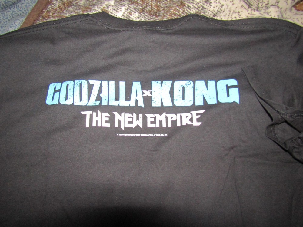 Show off your love for the legendary monster Godzilla with this sleek black t-shirt featuring artwork from the epic movie crossover, "Godzilla x Kong: The New Empire". Made from comfortable cotton and available in size XL, this t-shirt is perfect for any fan of the King of the Monsters. Whether you're a collector of movie memorabilia or simply a fan of the iconic character, this t-shirt is a must-have addition to your wardrobe. With a crew neckline and short sleeves, it's perfect for casual wear or for showing off your fandom at a convention or movie screening. Get your hands on this Gildan brand t-shirt and show your love for the ultimate movie monster - without mentioning its condition.