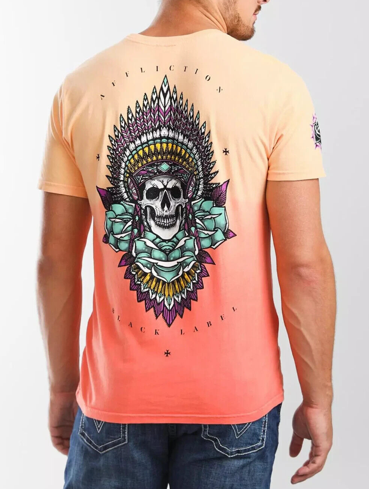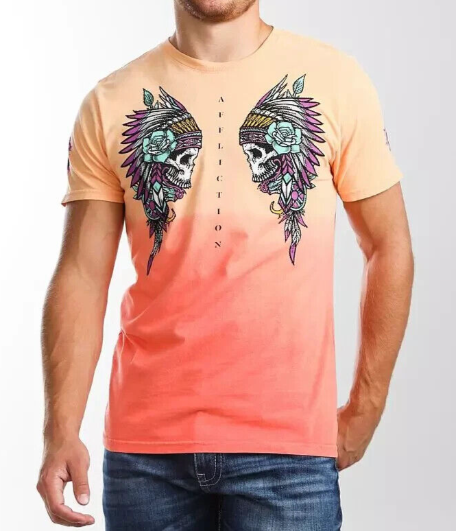 Affliction Black Label Men's “TWIN TRIBE” Short Sleeve Shirt; NWT Affliction Black Label Series: Unique street-inspired collection. Higher quality cotton fabrics and inks alongside unique patches, rhinestones, foils, and art design. It is very limited, very unique, and very Black Label. Made for those who want to stand out wearing something very few others have. DETAILS: Brand New, Sealed in manufacturers packaging with Tags These Are Very Limited Quantity. All Affliction Black Label are limited run patterns and styles. Authentic Affliction BLACK LABEL Men’s “TWIN TRIBE” Short Sleeve T-Shirt Exclusive Color: Sherber Neon Coral Dip Pre-Shrunk crew neck Rhinestone Graphics Dip dyed Short Sleeves 100% Cotton One-Of-A-Kind Hand Drawn Affliction Artwork Multicolor Rhinestone over graphic Tagless neck for comfort Retail price: $68.00 Style#: A24508 MEASUREMENTS: Size: Small, Large, X-Large available Please cross-check your measurements with the size chart provided. Measurements are taken un-stretched and laid flat. Feel free to ask about any other measurements you may need as this is a final sale . All of our clothes are sold factory-sealed, no one has ever opened, tried, or returned any of our items. FABRIC & CARE: 100% Cotton Machine wash cold with like colors. Do not bleach. Tumble dry low. Do not iron. Do not dry clean. I personally hang dry all my Black Label, I also use Woolite Dark Defense for wash, helps keep colors longer. Black Label shirts are very limited run, once they are gone – favorites are nearly impossible to find again. Each garment is a unique, handcrafted work of art. It has been designed with variations from one garment to another. PAYMENT & POLICIES: · We accept PayPal and any major credit cards and/or debit cards. · NO returns, refunds, or exchanges. This is a FINAL SALE . Please note, we do not accept returns because we sell only factory sealed clothing. No one has ever worn, tried, or used this shirt. It arrives to you brand new as made from the company. · Please give us 2 days to process your order after receiving a cleared payment. · Please pay within 3 days of winning the auction, or we reserve the right to cancel the transaction and relist the item. · By purchasing this item, you are acknowledging that you have read and understood the terms and conditions outlined in this listing. SHIPPING & POLICIES: · We weigh each item to its exact weight and ship as cheaply as possible to keep costs as low as possible. · Combined and/or discounted shipping on multiple item purchases is available when the items are paid for the same day. · Please make sure that your mailing address is current and correct . ISSUES & DEFECTS: Each garment is a unique, handcrafted work of art. Each garment is individually dyed for a unique character. Therefore, variations in fit and natural shading are the inherent qualities of this garment. Color loss will continue over time, and some color may rub off, especially when wet. Care should be taken when wearing light-color garments. Please follow care instructions. Each garment will have a small variation in color and sizing due to the different techniques used. No two styles will be exactly the same. The hand distressed edges and a worn-in vintage look are part of the manufacturing process and are intended to enhance the design. Holes, stains, and small tears are intentional and intended to make each garment unique. The color might be a bit different from the photos due to different lighting. Photos are taken with and without flash for comparison. Photos are representative of the item for sale and may vary slightly from the one received. Please do not hesitate to contact us with any questions. Thank you for your interest, and I look forward to our next transaction!