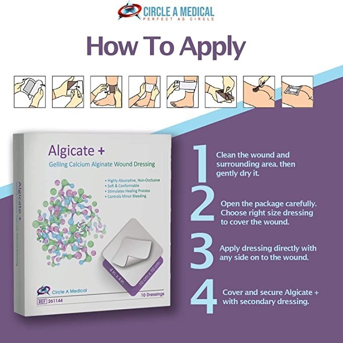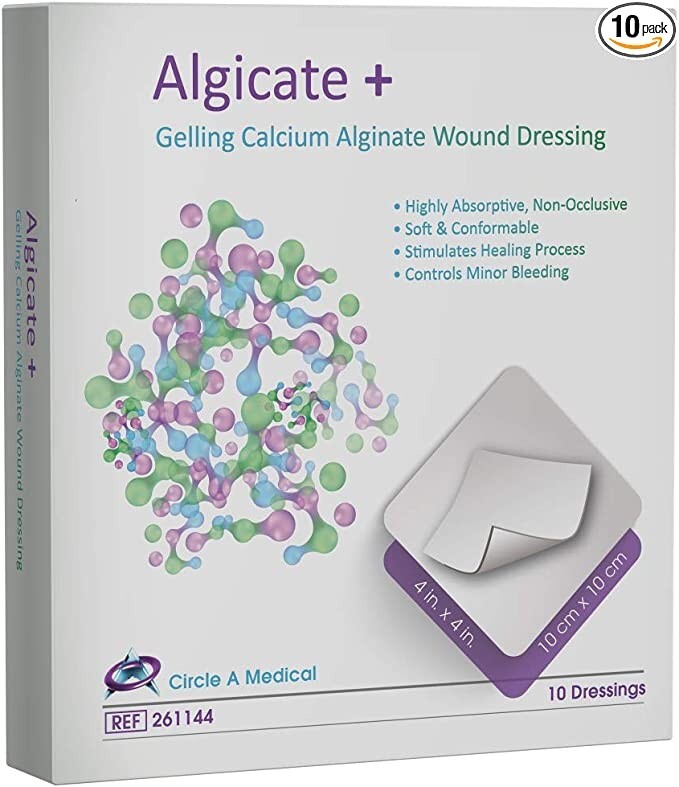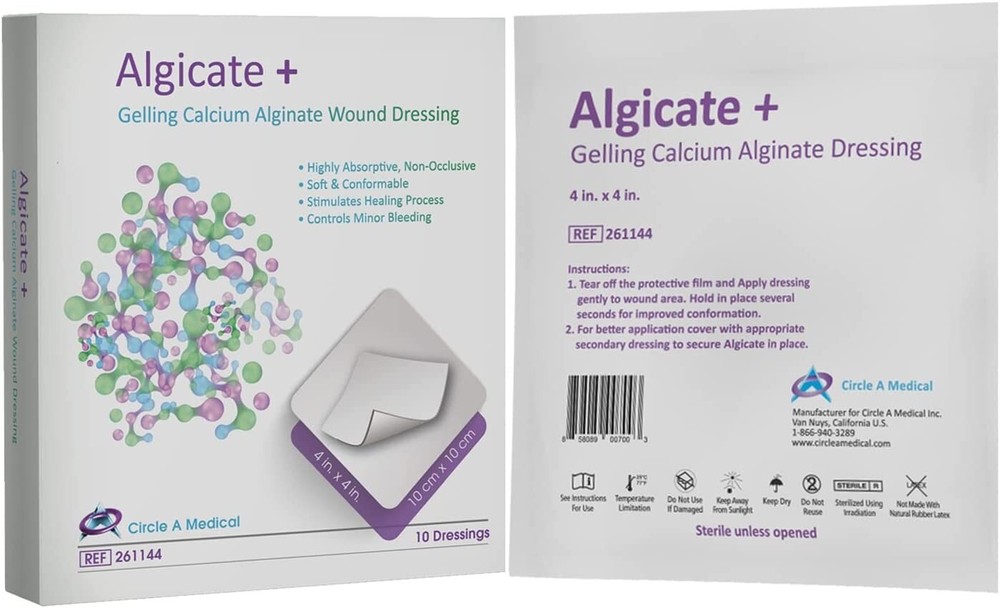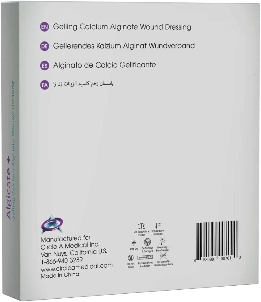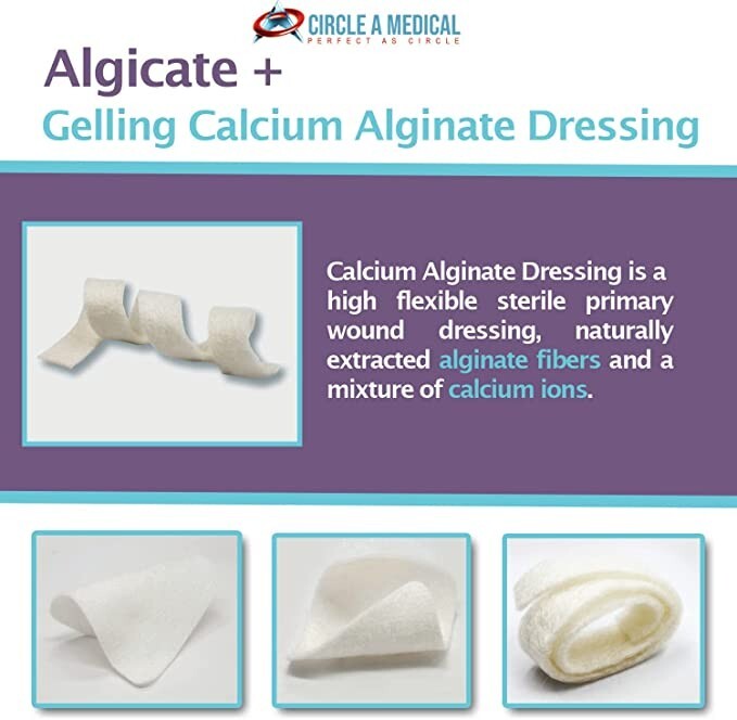 PRODUCT PERFORMANCE: Circle A Medical Algicate + Gelling Calcium Alginate Dressings is a natural polymer material extracted from brown algae plants. it is a kind of non- toxic harmless biodegradable pure natural green materials. APPLICATION: Circle A Medical Algicate + dressing turns into a soft sticky wet gel once contacts with wound exudates to provide wound moisture in which does not dry quickly. so then the healing process will be accelerated. SEAWEED NATURAL FIBER: Circle A Medical Algicate + Dressing is made of natural fibers derived from seaweed. Strip shape Algicate dressing can fill cavity wounds and be less sticky to the wound surface, minimizing pain while dressing changes. PACKAGING: Available in 4 sizes (2' x 2' - 4' x 4' - 4' x 8' - 0.75' x 12'). Each box contains 10 Individually wrapped sterile dressing. Its hygienic Alginate dressing ensures the wound is protected against water and bacteria contaminations. HOW TO USE: Carefully clean the wound and its surrounding area with sterile water, dry the surrounding skin gently. Open foil envelope by peeling edges down to allow aseptic removal of the dressing. To unfold dressing, grasp both ends with sterile forceps and pull apart or cut with sterile scissors to meet specific size requirements.Then place the gauze on the wound. An appropriate absorbent secondary layer should be used to secure the Algicate + gauze dressing.