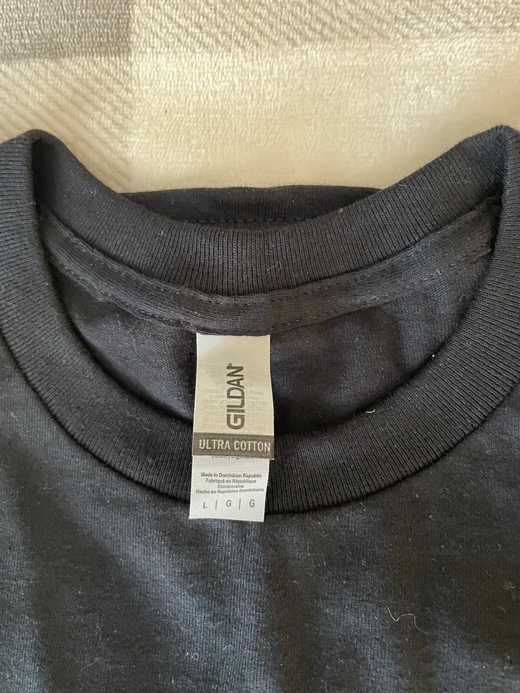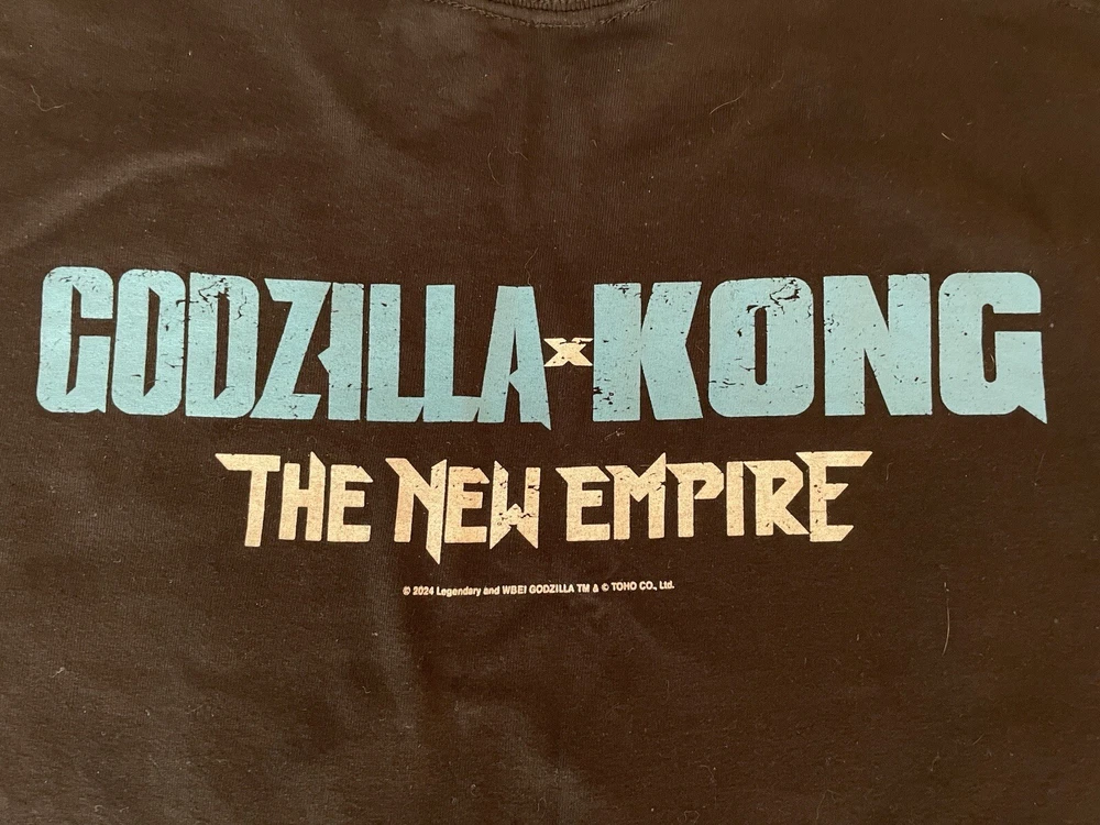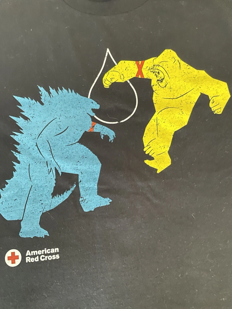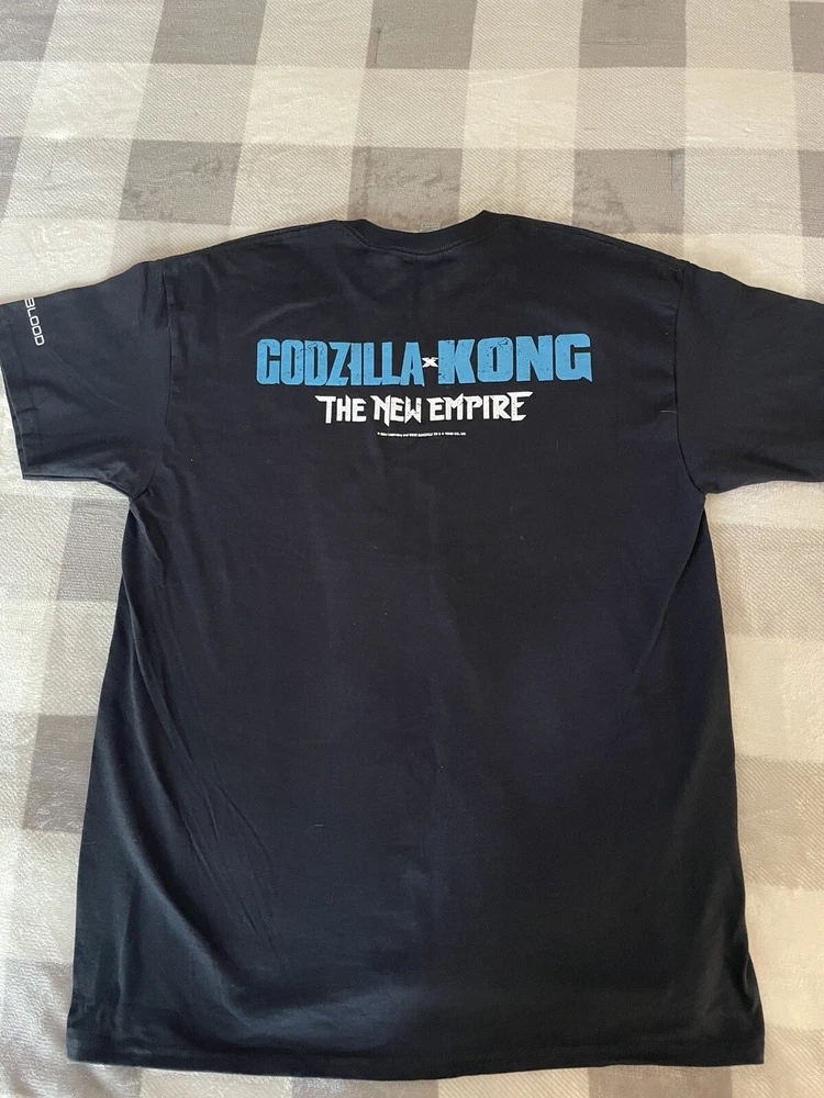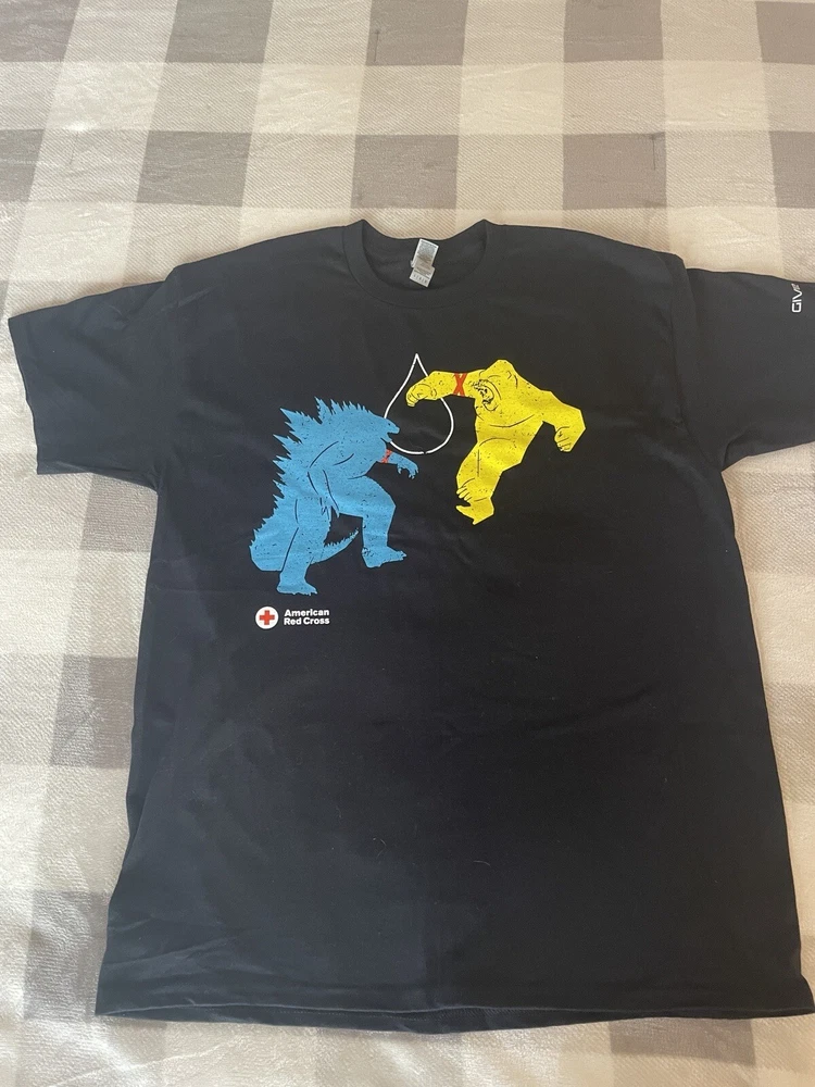 This is a black unisex t-shirt featuring Godzilla and Kong from the movie "New Empire". It is a regular fit with short sleeves and a round neckline. The shirt is size Large and made by the American Red Cross. This t-shirt is a collectible item and has never been worn before.