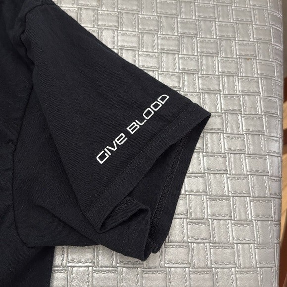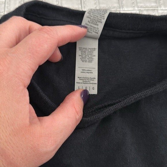 Black crew neck with yellow, blue white, and red graphic...