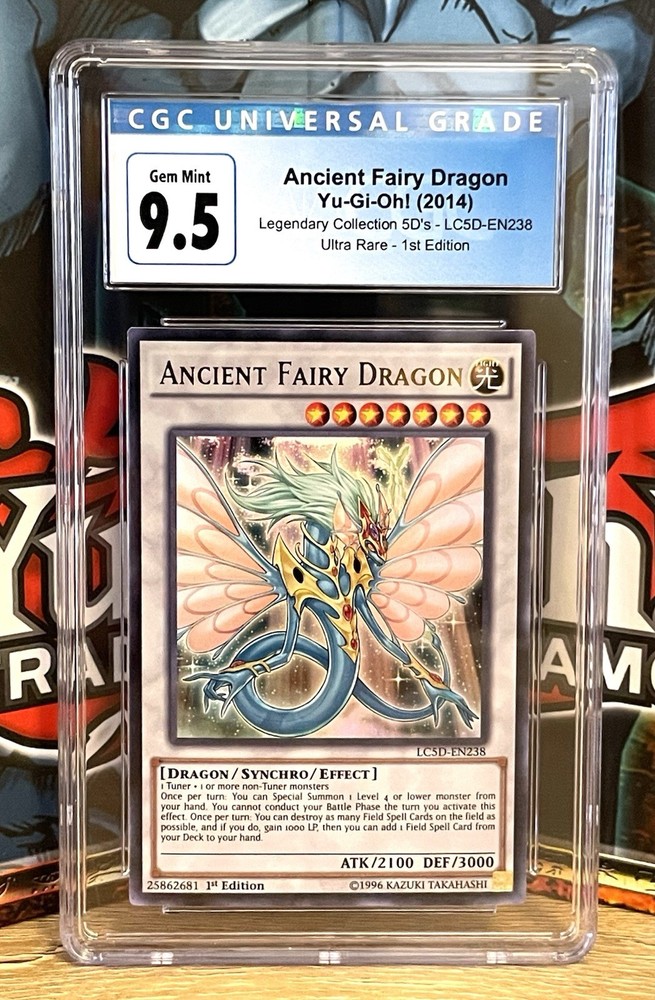 The Ancient Fairy Dragon card from the Legendary Collection 5D's set is a highly sought-after ultra rare 1st edition card in the Yu-Gi-Oh! TCG. Graded at 9.5 by Certified Guaranty Company (CGC), this card is a must-have for collectors and players alike.