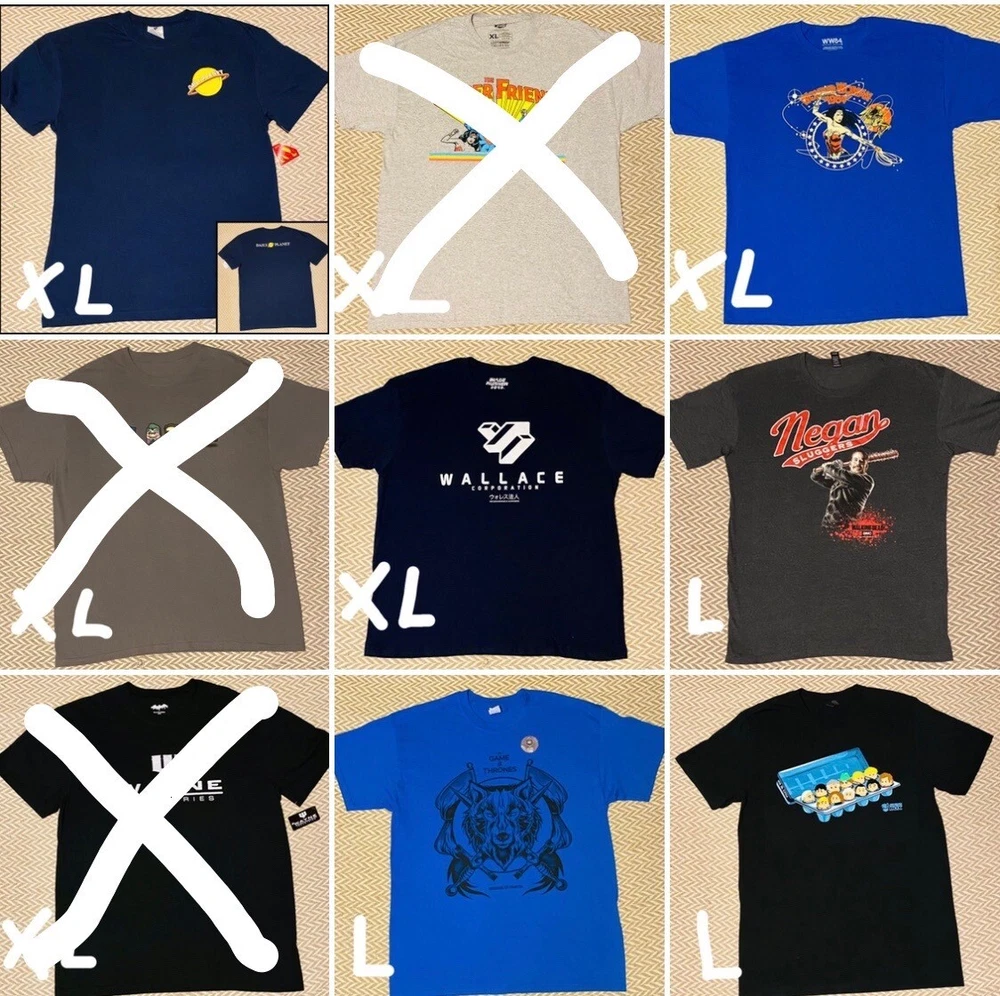 Assorted NEW Television T Shirts Adult Large & X-Large Choose! $10 each, 2 for $16, 3 for $20! Select your shirt choices by the picture, DM me with what shirts you want and I will let you know if they are still available. Feel free to mix and match with my other listings! If you just want one, that's great pay the buy it now price $10 for 1. If you want more than one with the discount, OBO (best offer) me the amount for two shirts, Example: OBO me $16 then DM me what TWO shirts you want and I will accept the offer. Each shirt has an individual picture for a look at the entire shirt logo. These shirts are all NEW from various subscription boxes such as Funko, Nerd Block, and LootCrate All TV themed, some have tags and some do not. Some are polyester blends, some are cotton etc. If you want to know the specific material of a shirt or have any other questions, feel free to message me! None have been worn, just a little wrinkled from being stored folded up. All shipped safely through USPS first class, after 2 shirts it will likely be priority mail due to weight. NO RETURNS sorry No International shipping Thank you for checking out the listing!